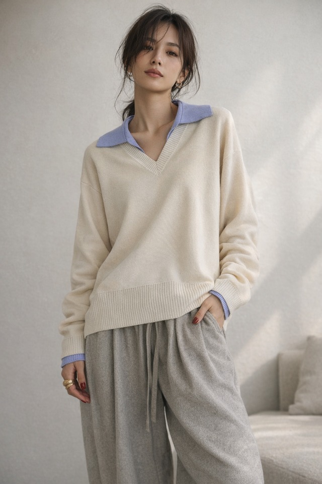 91871 トップス サイズ 身丈54 身巾57 肩巾56 袖巾23 袖丈46/54 裾巾58 素材 アクリル100% トレンドライクなシャツレイヤード風ポロニット 程よいハリ感と柔らかい着心地が魅力のバルキー素材を使用 襟部分と袖のみレイヤード風のデザインですっきりと着用いただけるアイテム お取り寄せは納期5日前後頂戴しております