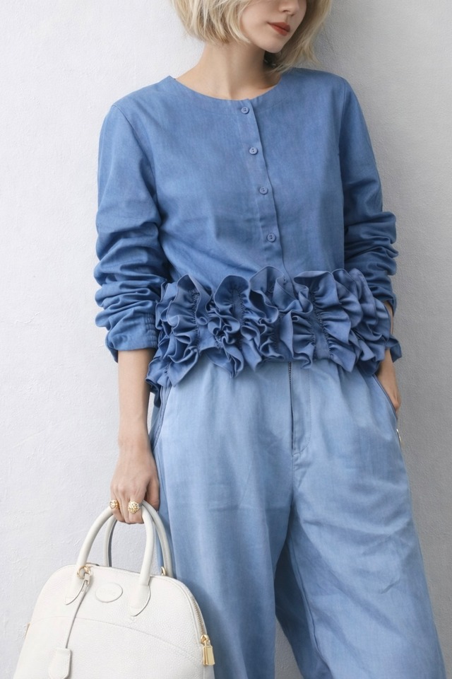 80871 トップス サイズ 着丈44.5cm 身幅51cm 肩幅41cm 袖丈56cm 素材 綿70% ポリエステル30% デニムフリル前後2way着用可能なブラウスです。 お取り寄せは納期1週間前後頂戴しております。