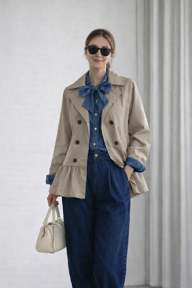 63002 アウター サイズ 着丈50cm B着丈47cm 肩幅44cm バスト104cm 袖丈60cm 袖口30cm 裾周り110cm 素材 表地 ポリエステル78% レーヨン17% ポリウレタン5% レース部分 ナイロン100% 裏地 ポリエステル100% 大人カジュアルにちょうどいいショートジャケット。 コンパクトな丈感だからワイドデニムと合わせるだけで自然とスタイルアップ。 襟元のレースとリボンがさりげなく女性らしさもプラスしてくれます。 デニムにもスラックスにも合う春の万能アウター。 シンプルだけど「なんかおしゃれ」に見える一枚です。 お取り寄せは納期5日前後頂戴しております。
