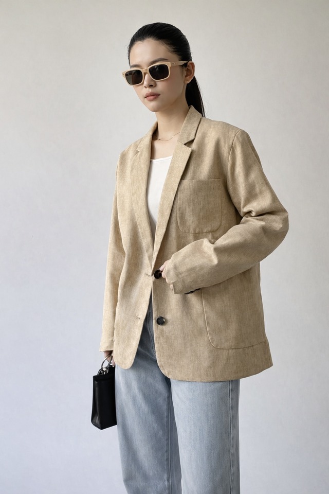 53871 アウター サイズ 着丈 前/後74/72 バスト112 裾巾55 肩幅47 袖丈61 天巾17.5 袖口15.5 素材 表地 ポリエステル:100% 裏地 ポリエステル:100% 大人カジュアルでリネンライクのオーバーサイズジャケットが登場! ナチュラルかつマニッシュな印象のオーバーサイズテーラードジャケット。 ウエストを絞らず体のラインを拾わないゆとりのあるボクシーなシルエットでカジュアルに着こなせるのも嬉しいポイントです。 ミックス調の表情のある生地で軽やかな印象で、ゆるっと着れるサイズ感でちょっとしたお出掛けの時にも、羽織りとしても使いやすいアイテムです。 お取り寄せは納期5日前後頂戴しております。