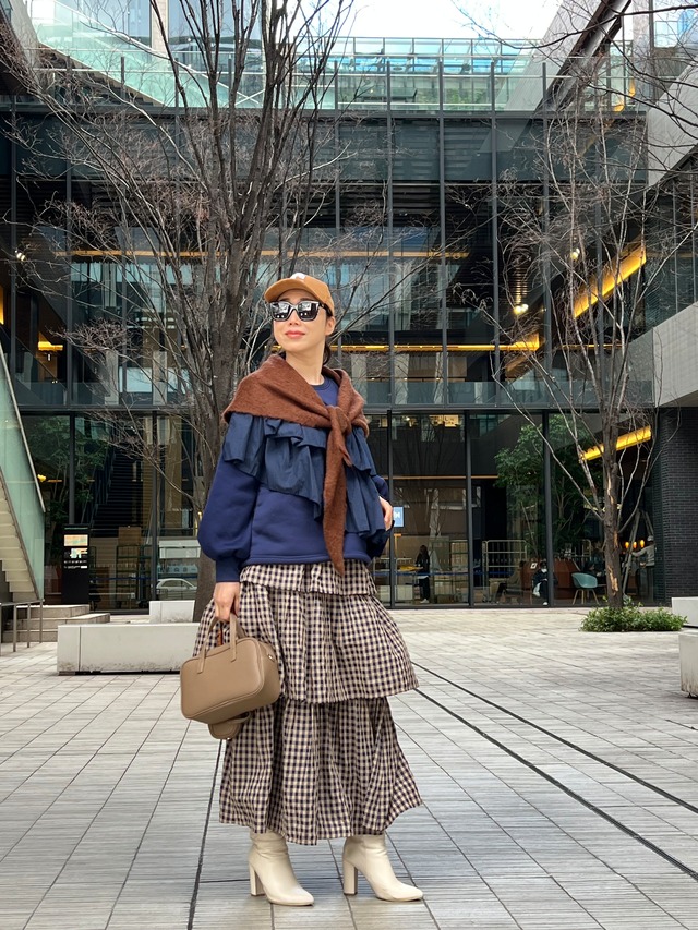 88561 スカート サイズフリー 着丈95cm ウエスト66〜92cm ギンガムチェックがオシャレなティアードスカートです。 ティアードのシルエットでキュートながら洗練された印象に!(裏地付きです) 雰囲気のあるカラーでちょうどいい抜け感を演出できる今シーズンの必須アイテム!