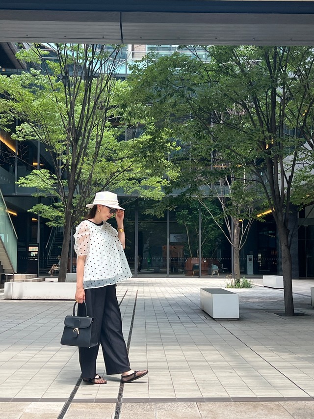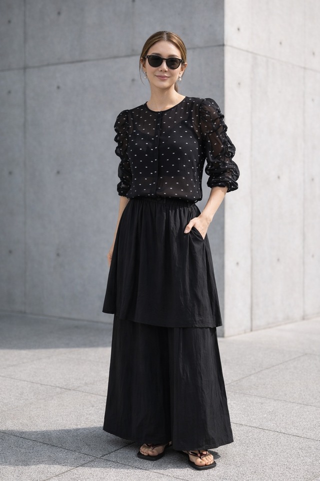 85971 パンツ サイズ 着丈95cm ウエスト31cm 股上35cm 股下64cm 素材 本体 レーヨン 65% ポリエステル 35% 別布 ポリエステル 100% 軽やかなチュールを重ねた存在感のあるワイドパンツ。 アシンメトリーなフラップデザインとボタンディテールがモードな印象を与えつつ、ふんわりと透けるチュールが女性らしい抜け感をプラスします。 ウエストはゴム仕様でリラックスした穿き心地ながら、スタイルアップ効果のある美しいシルエットに仕上げました。 特別なお出かけからデイリーまで、コーディネートに華やぎを添える1本です。 お取り寄せは納期1週間前後頂戴しております。
