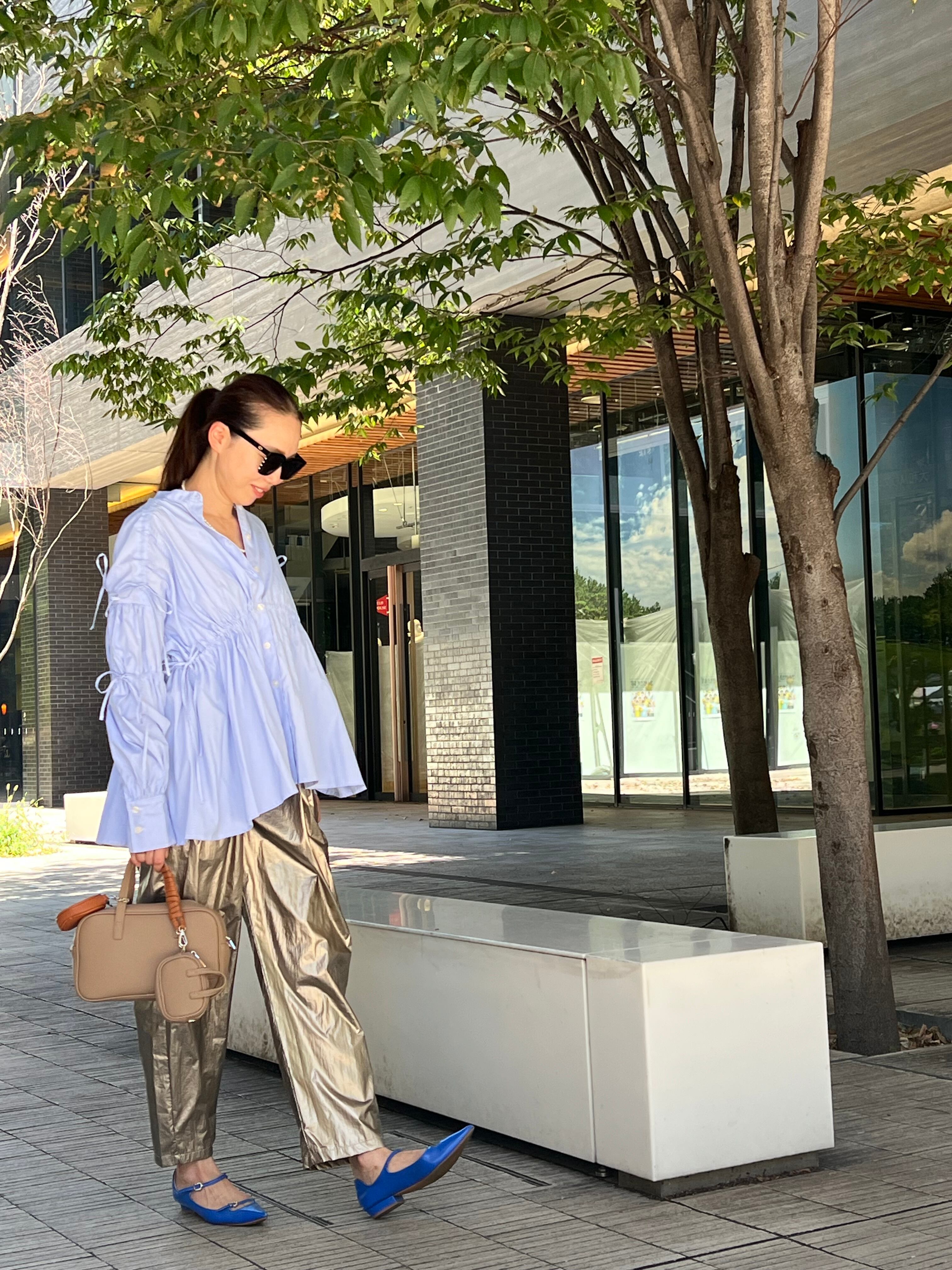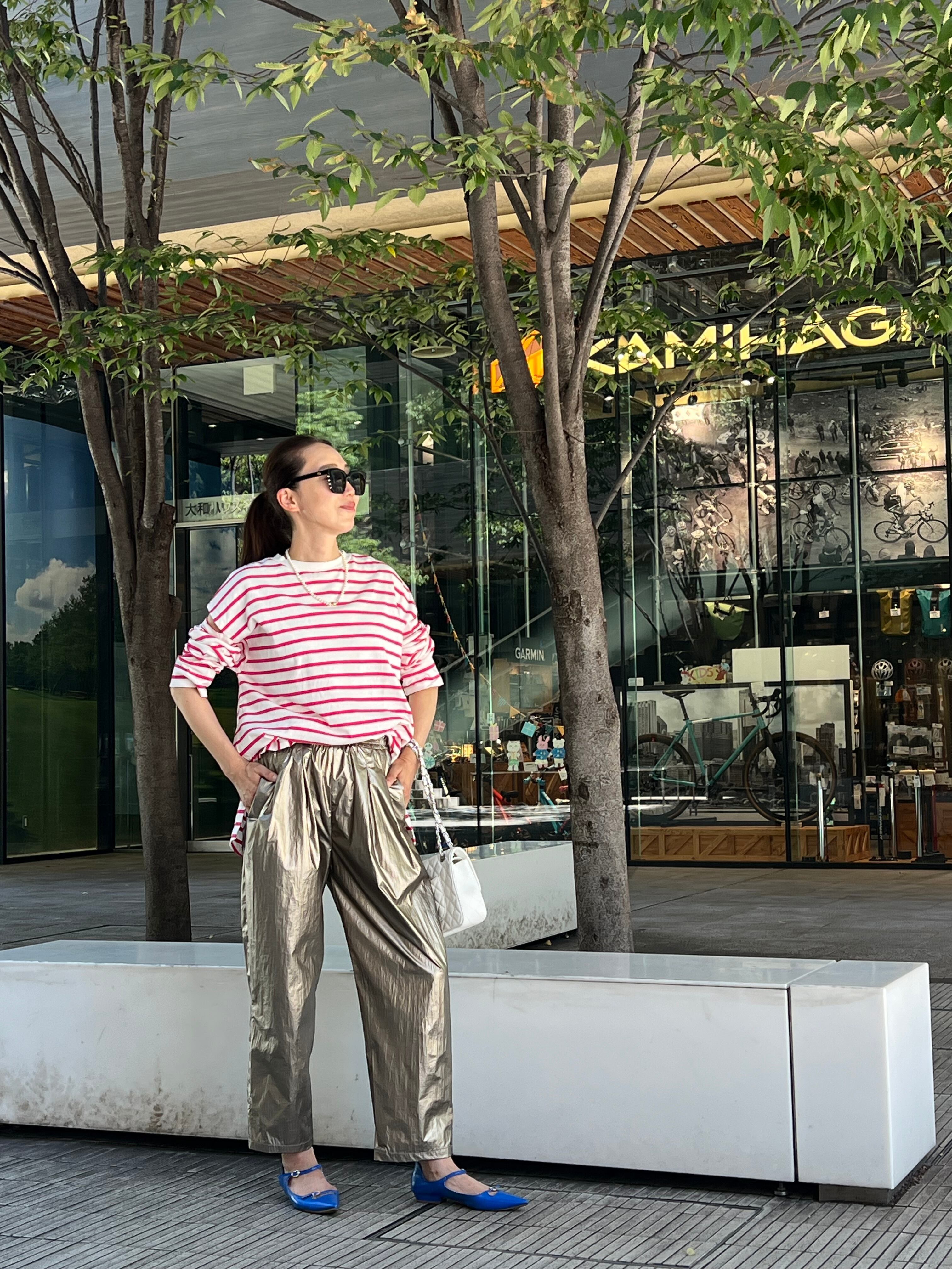 注目のリラックスパンツの新作!メタリックタフタが今の気分にピッタリ