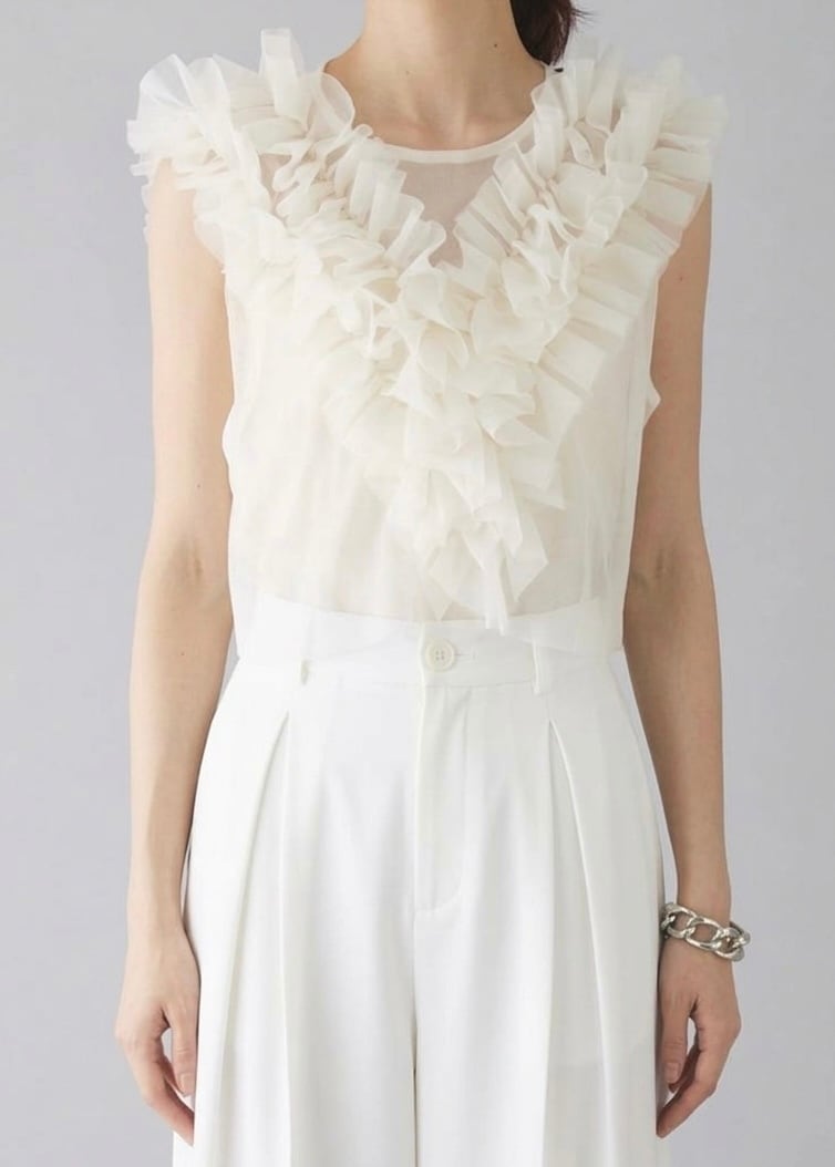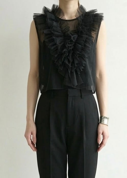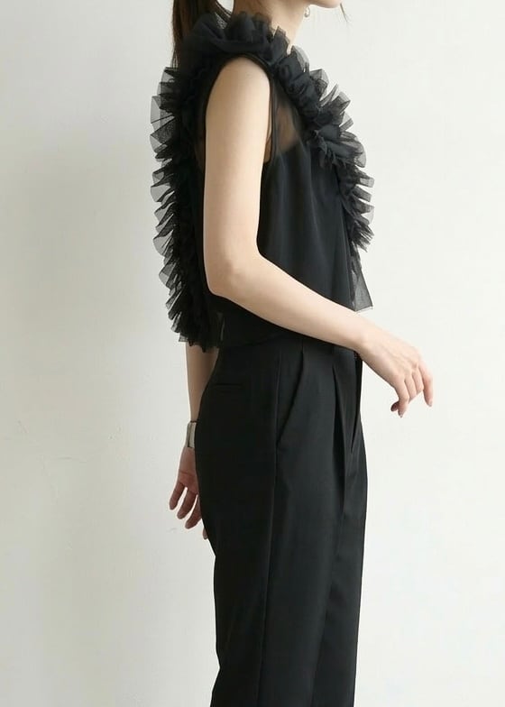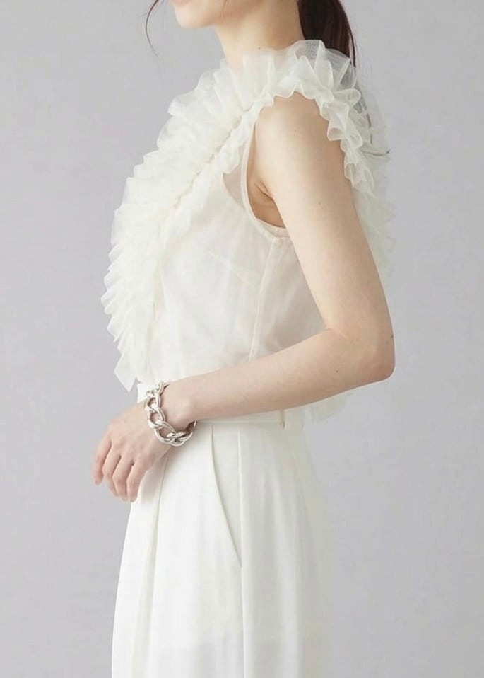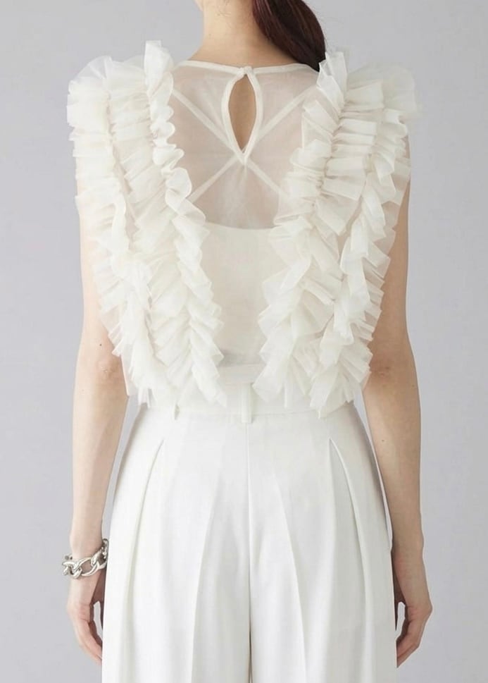 立体的なギャザーフリルが映えるチュール素材のノースリトップス。ボリュームのあるフリルもVラインを描くため、フロントはスッキリとした表情です。バックスタイルは、ドロップ開きによって抜け感があり、透けて見えるためインナーとのレイヤードもさまに。コンパクトなフォルムでボトムとのバランスが取りやすく、スラックスを合わせるなどテイストミックスもおすすめです。