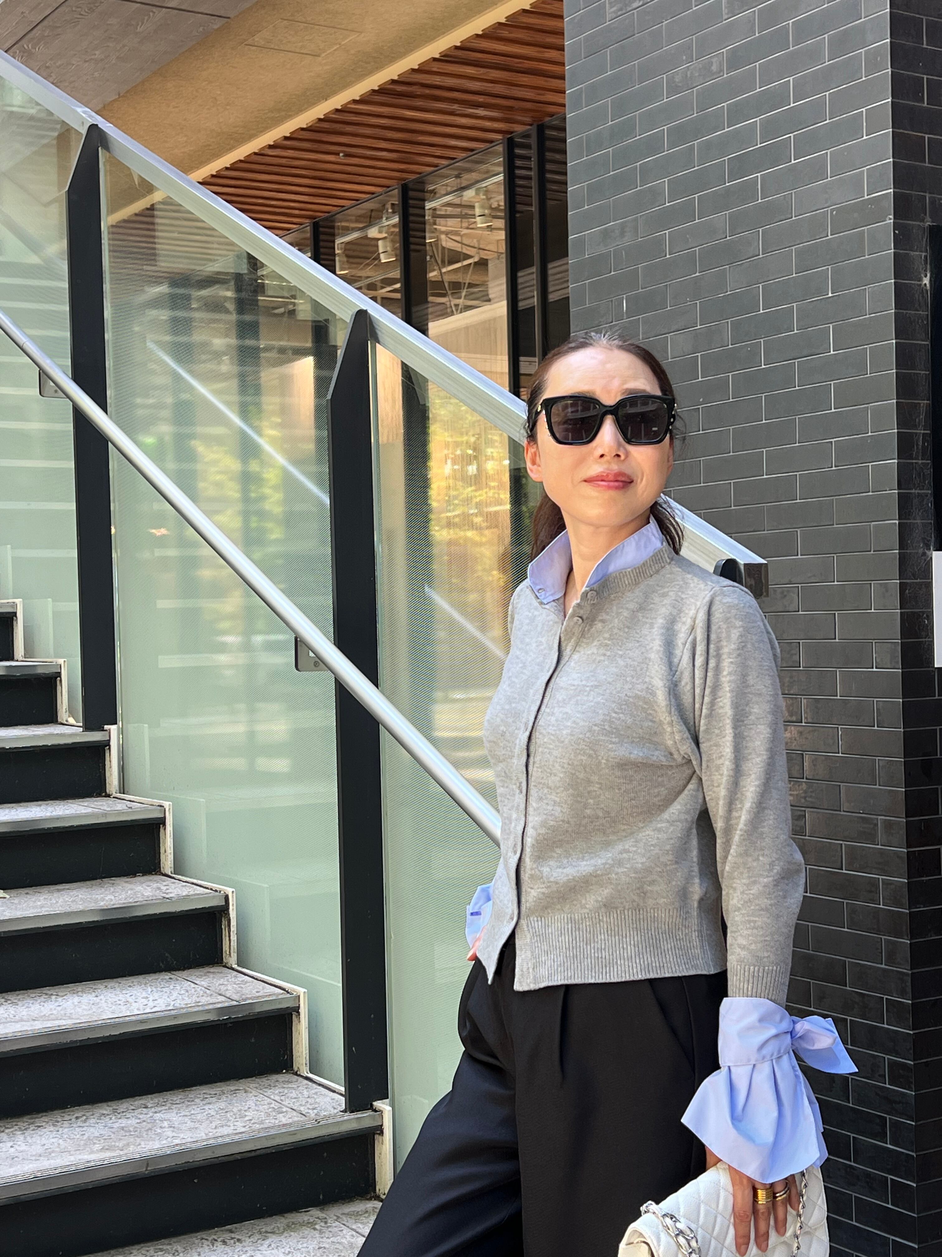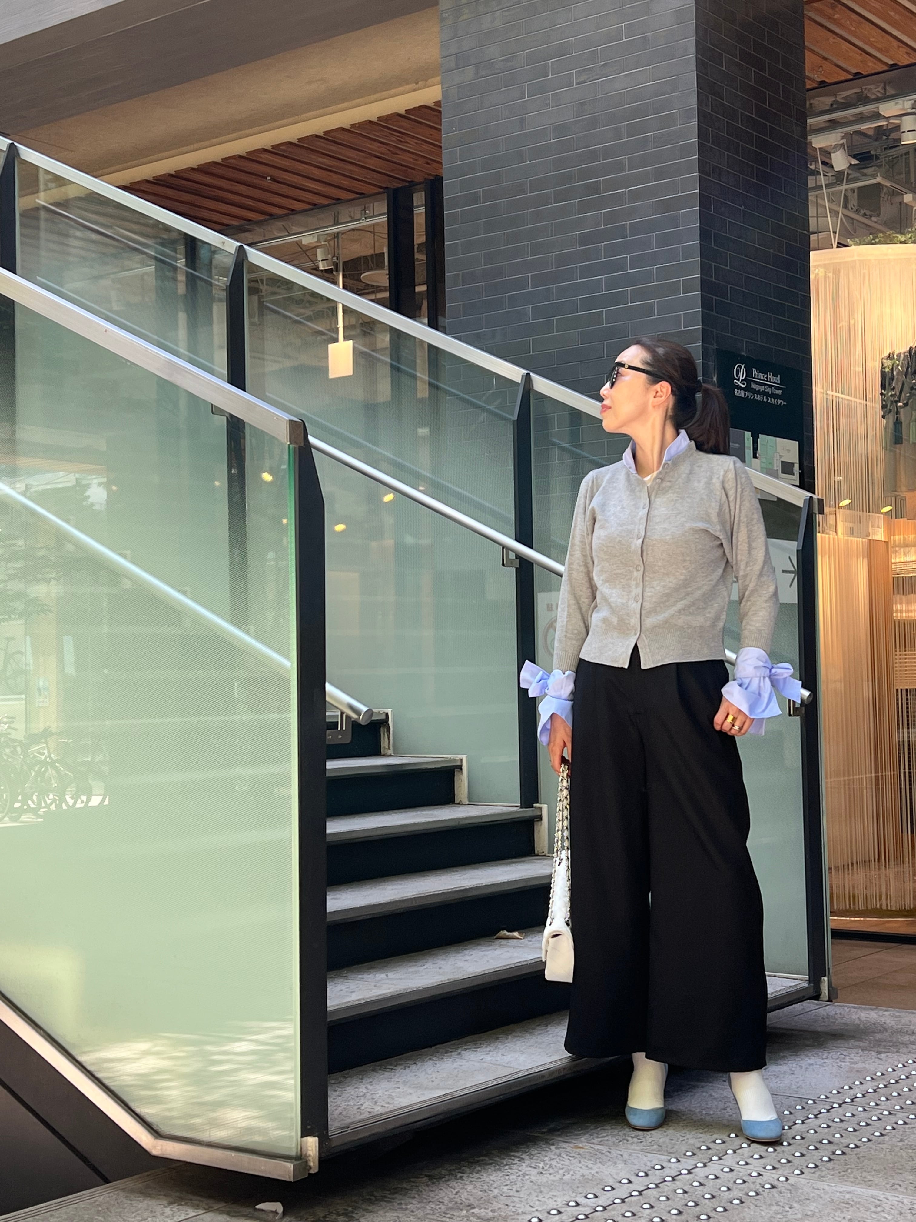 袖口はアレンジ可能で、リボン結びにしても、ラフに結んでこなれ感を出しても◎
