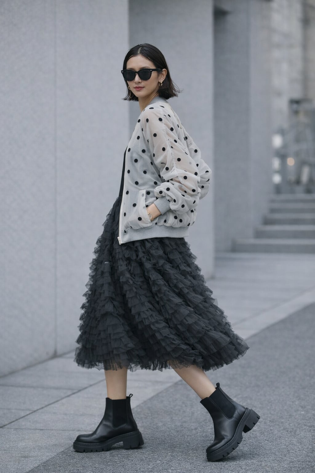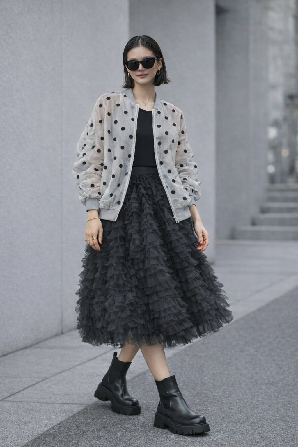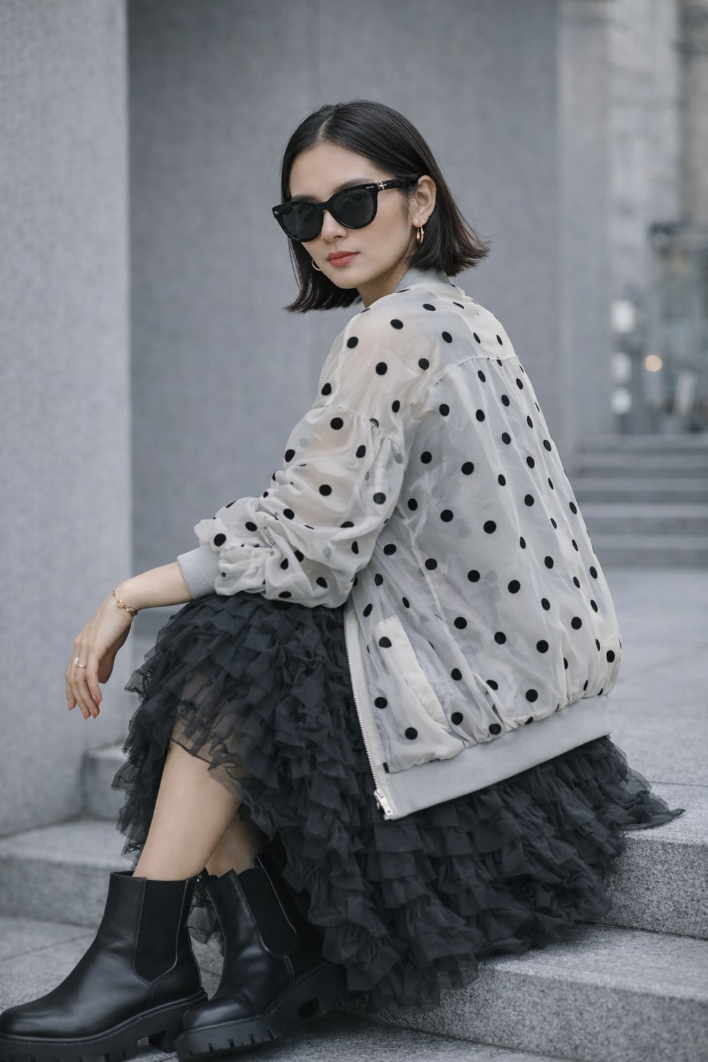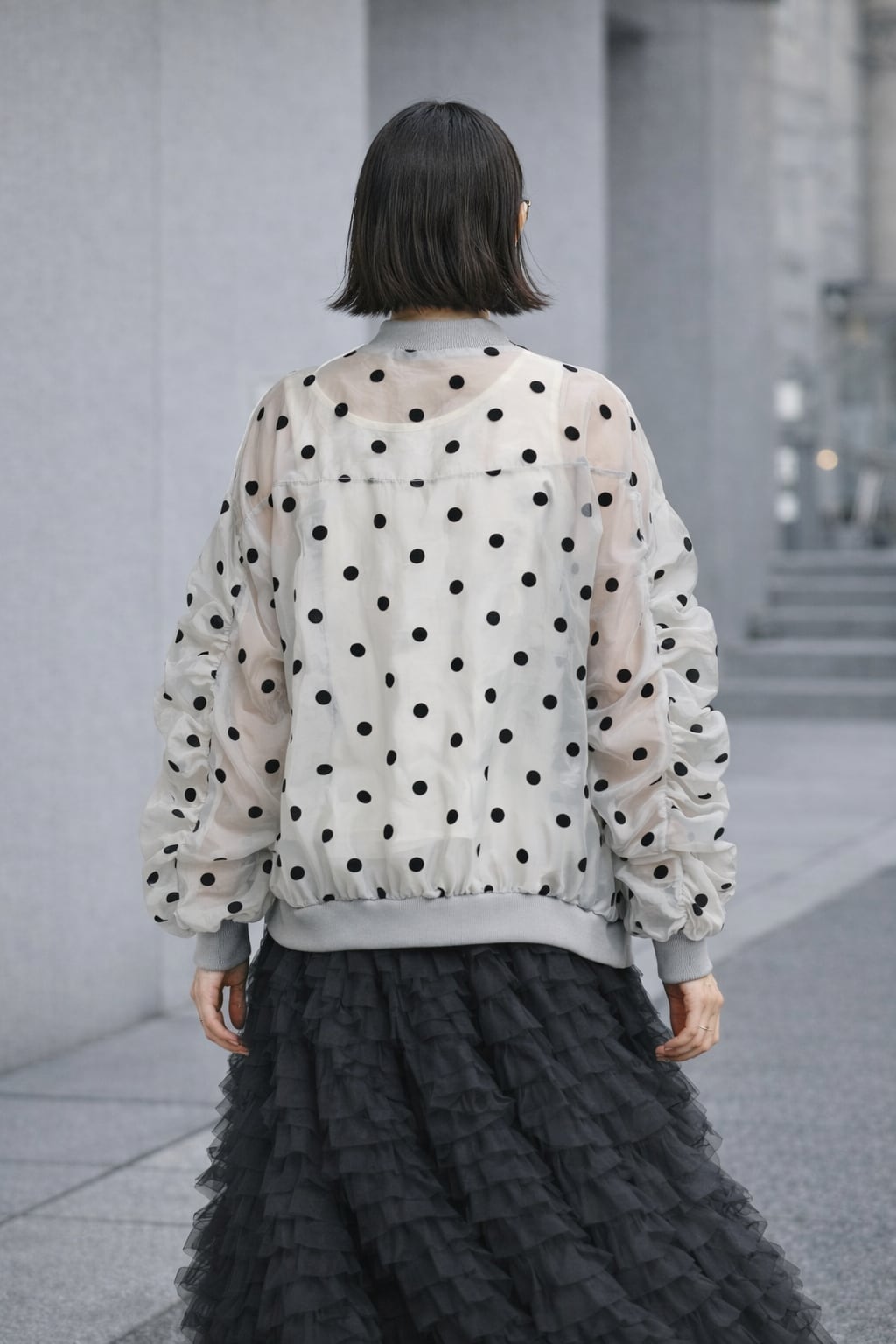 軽やかなチュール素材にドット柄をあしらったシアーブルゾン。