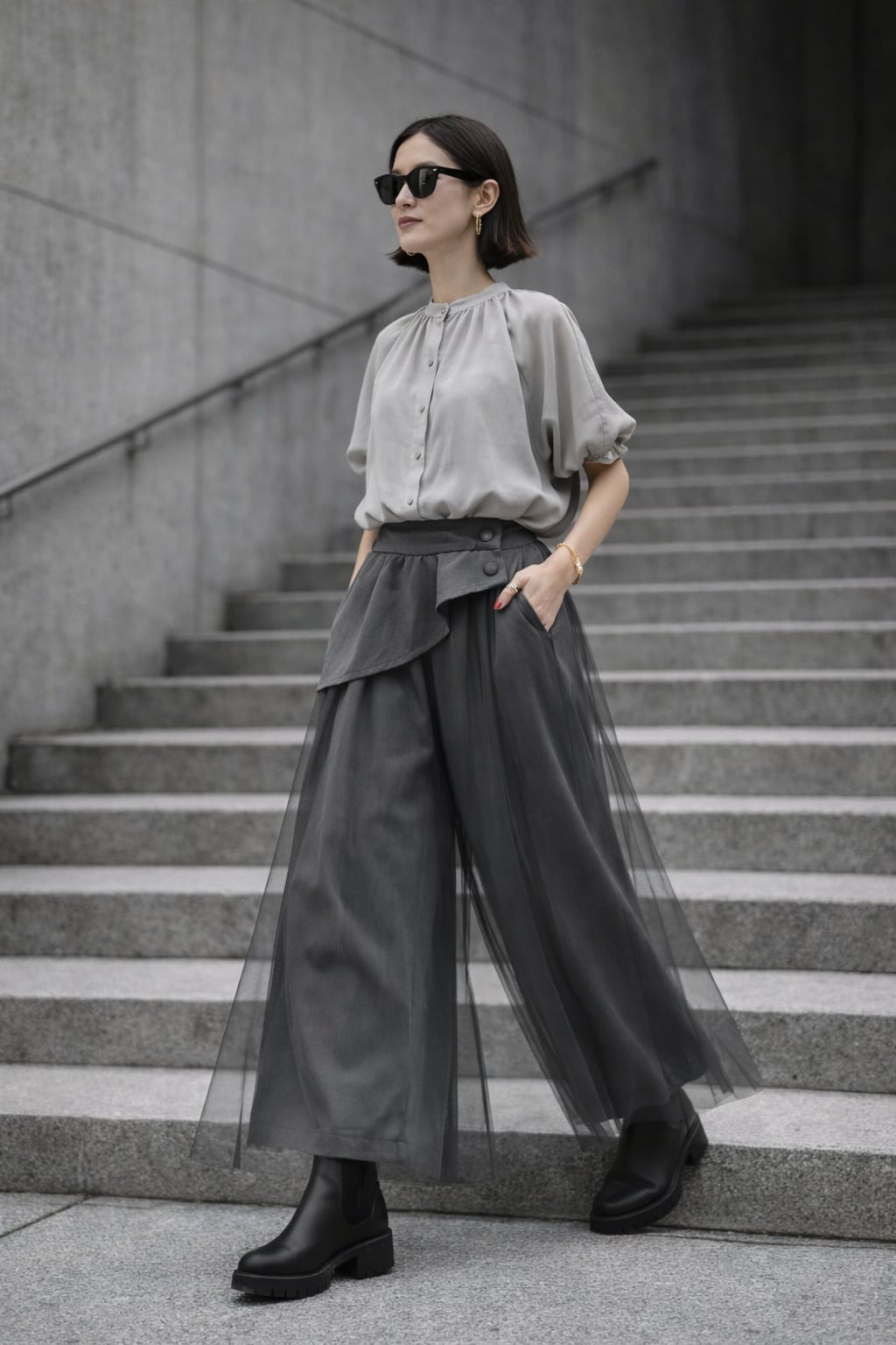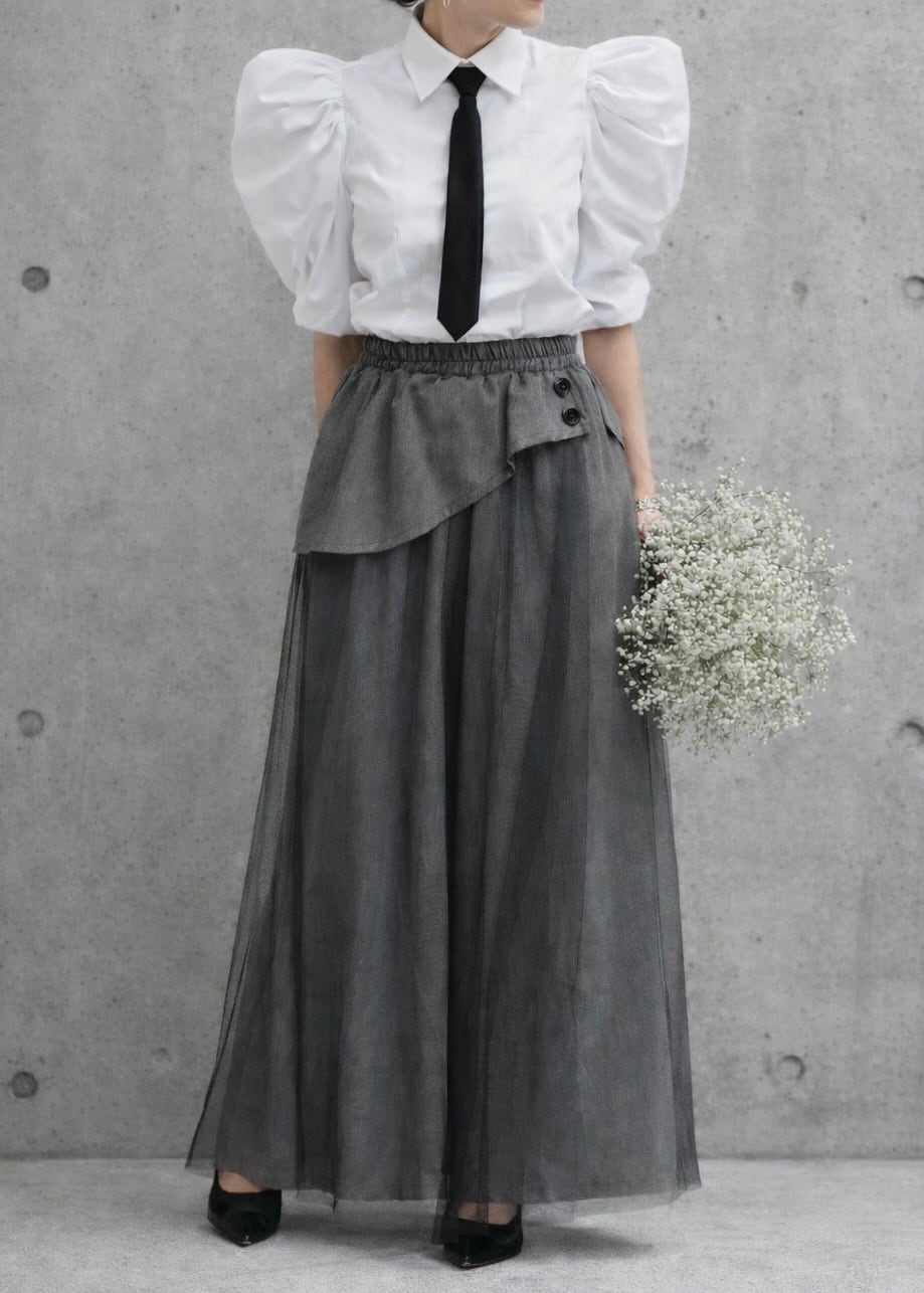 軽やかなチュールを重ねた存在感のあるワイドパンツ。