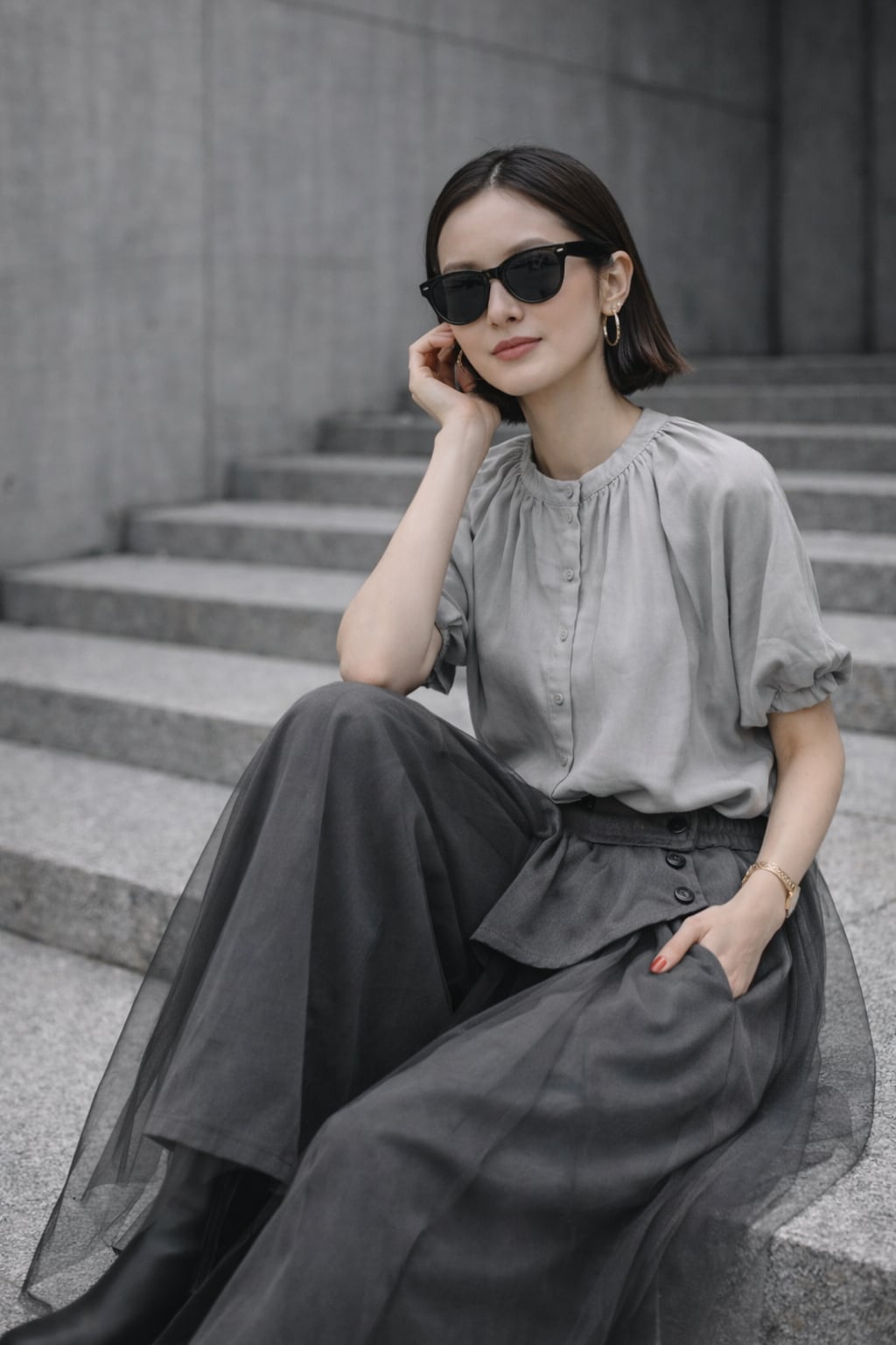 アシンメトリーなフラップデザインとボタンディテールがモードな印象を与えつつ、ふんわりと透けるチュールが女性らしい抜け感をプラスします。