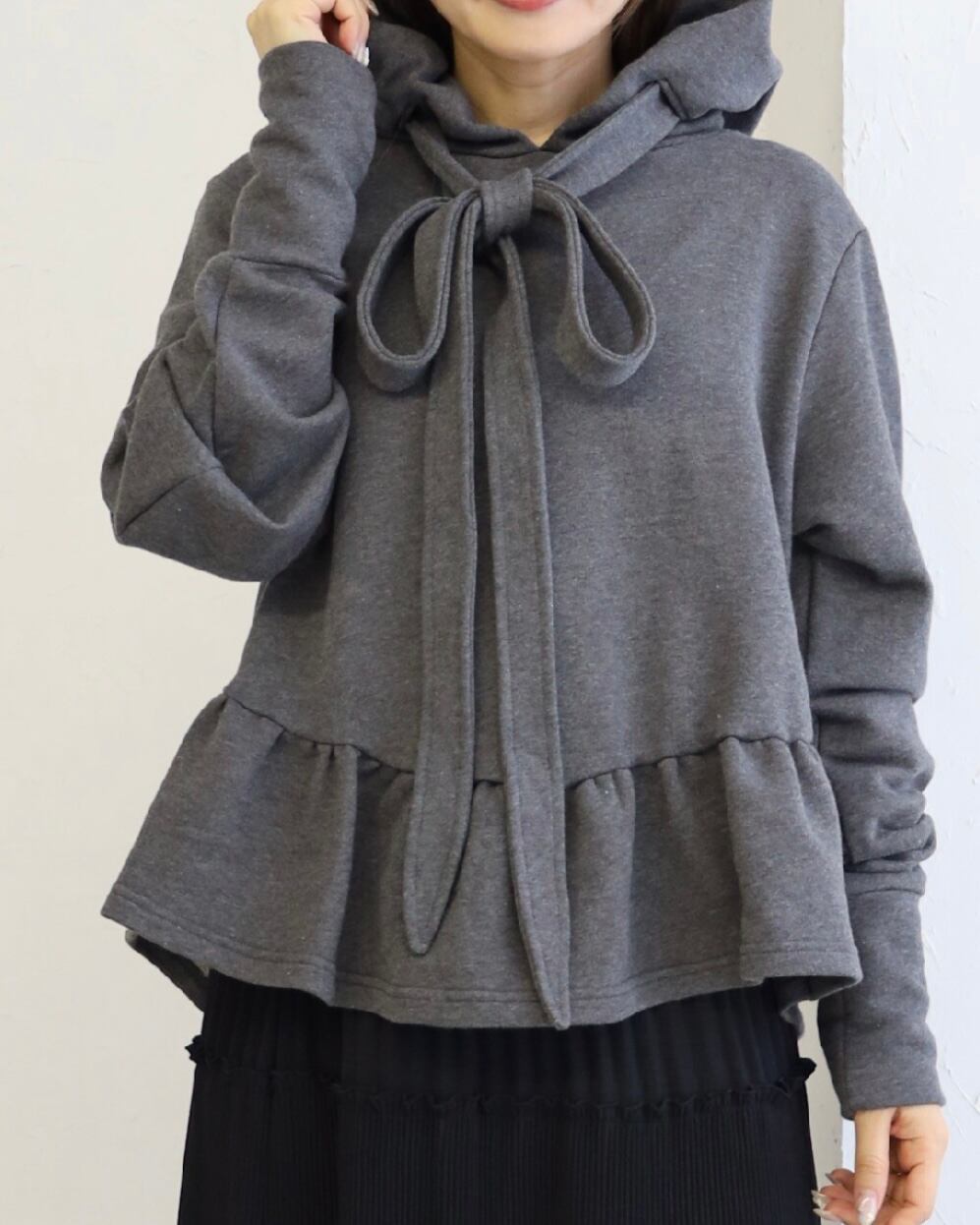 ボウタイリボンが可愛いフード付きプルオーバーです。