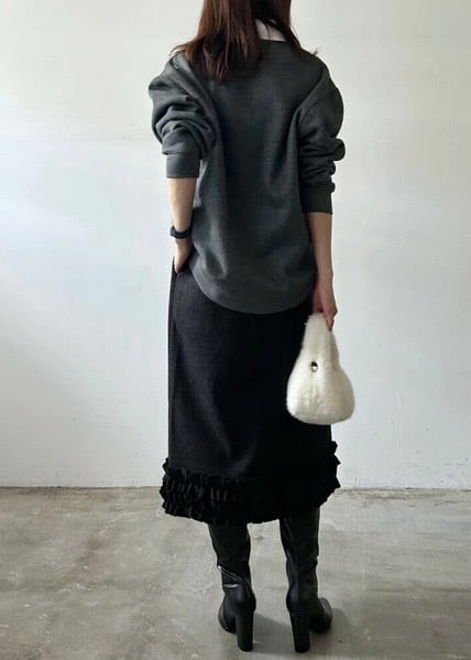 ほんのり起毛感のあるフェイクウール素材で、あたたかみのある表情に仕上げたミディ丈スカート