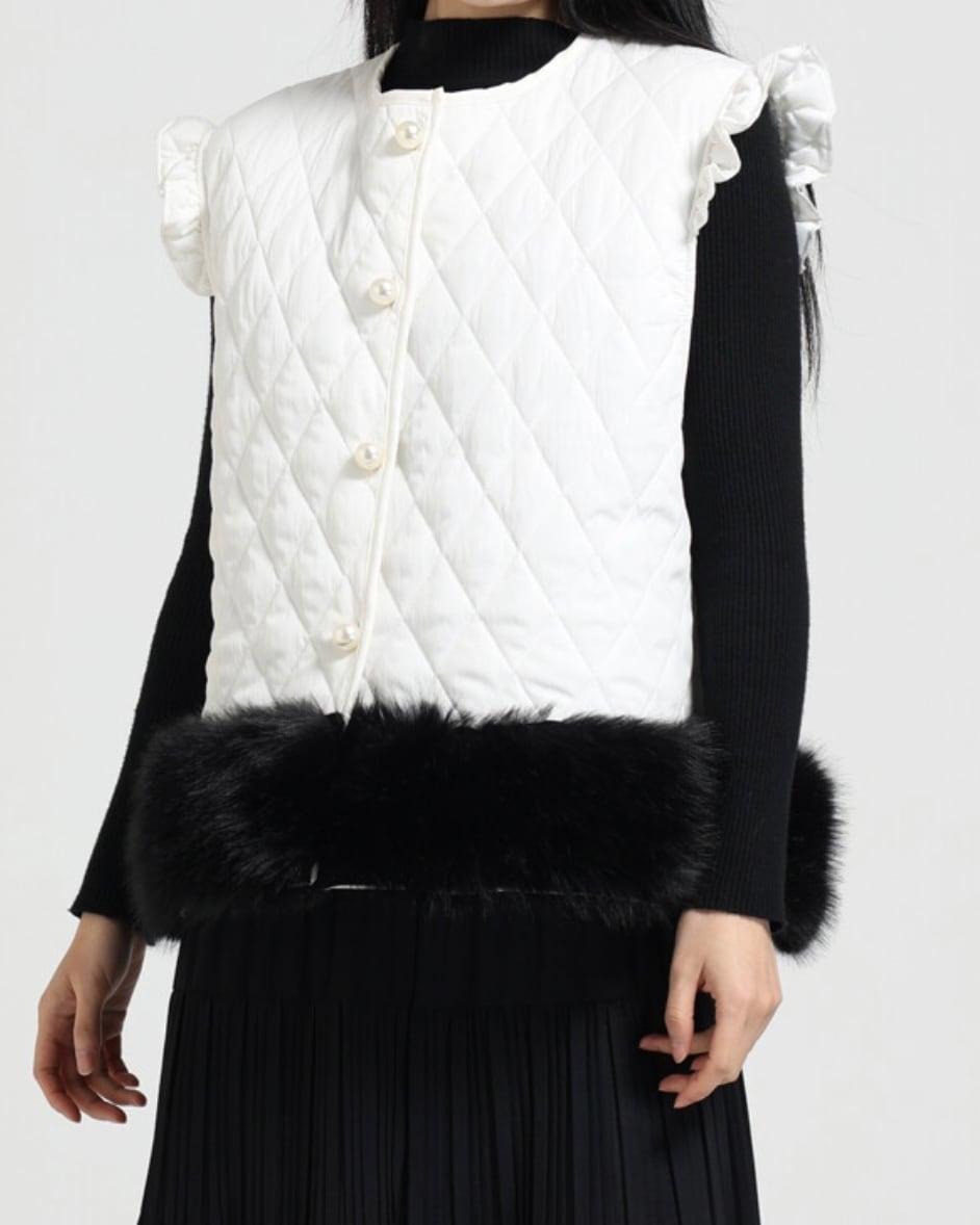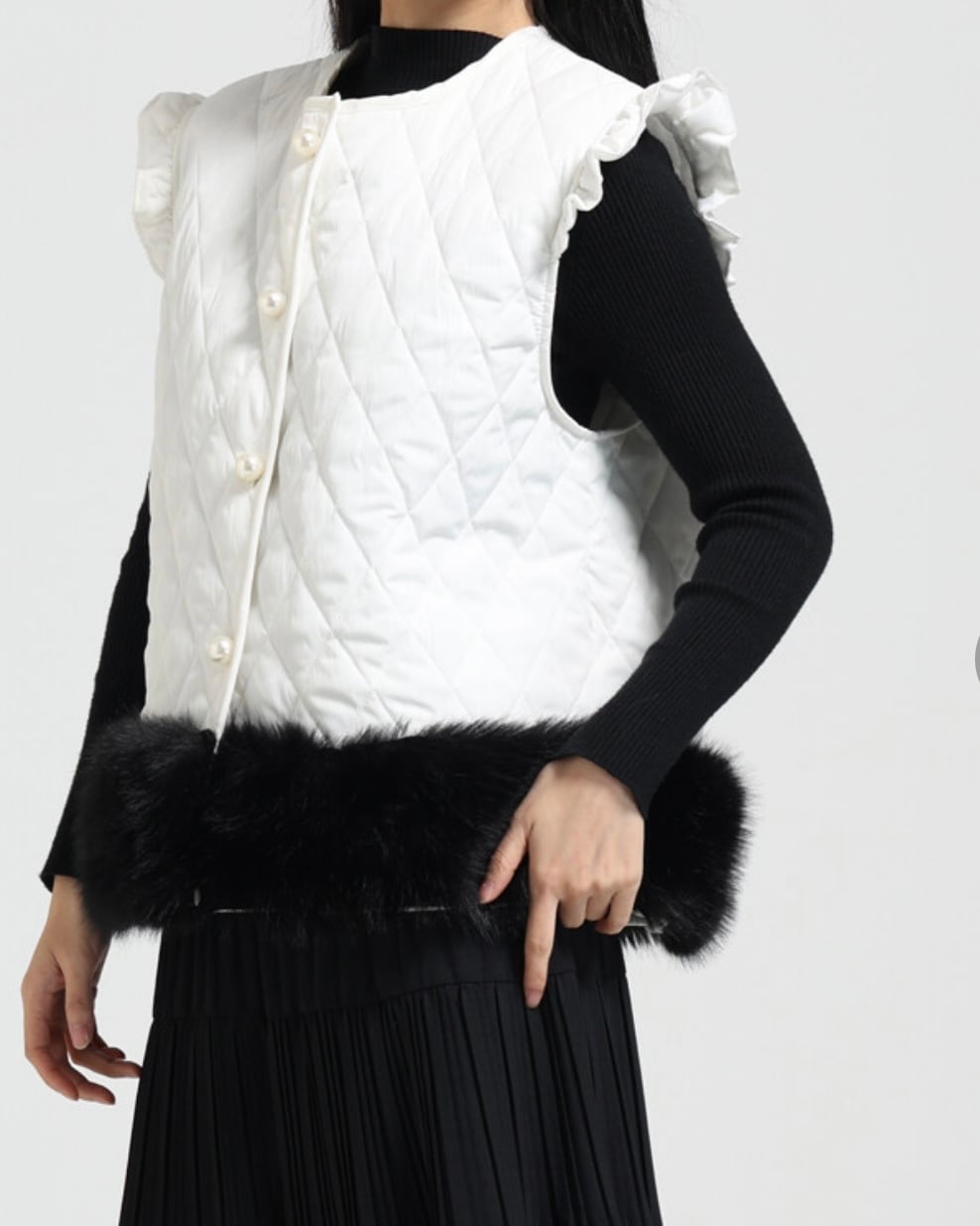 裾にあしらったフェイクファーが目を惹く、シーズンムードたっぷりの中綿ベスト。