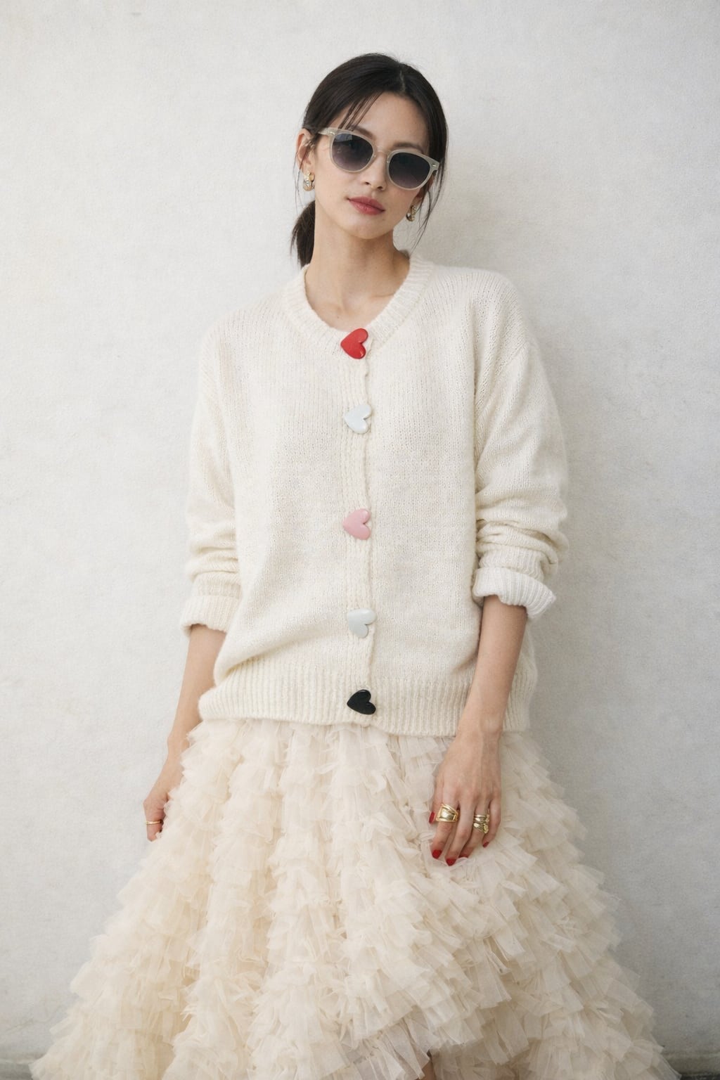 色とりどりの大きなハートのボタンが目を惹くカーディガン