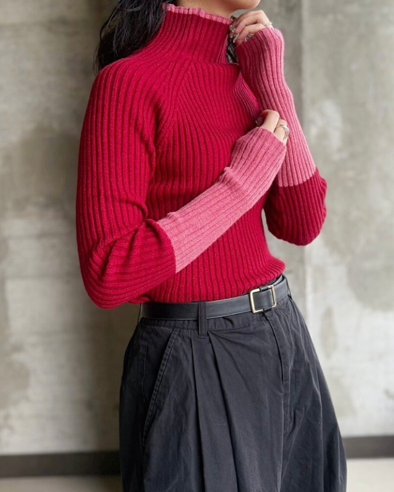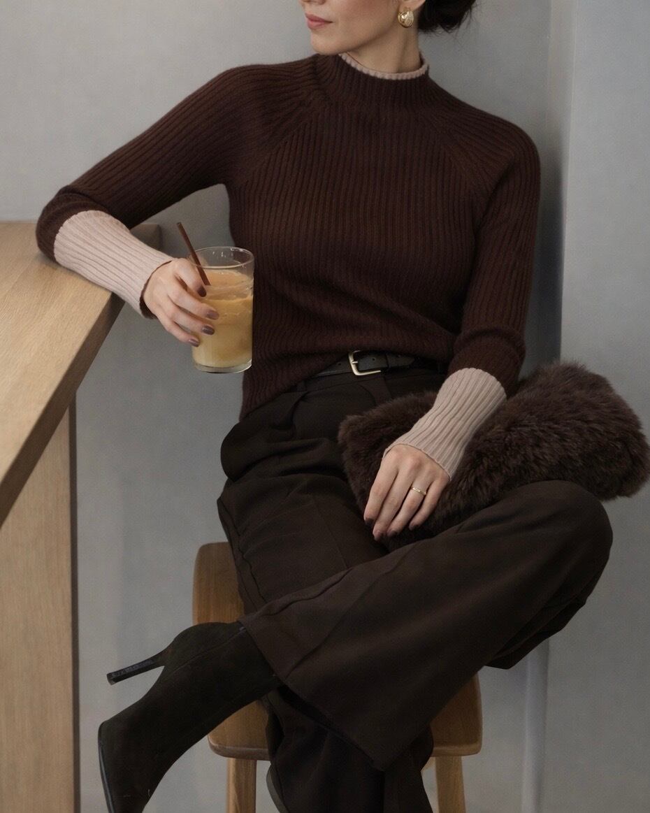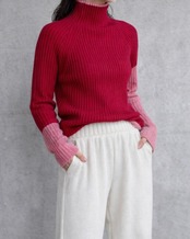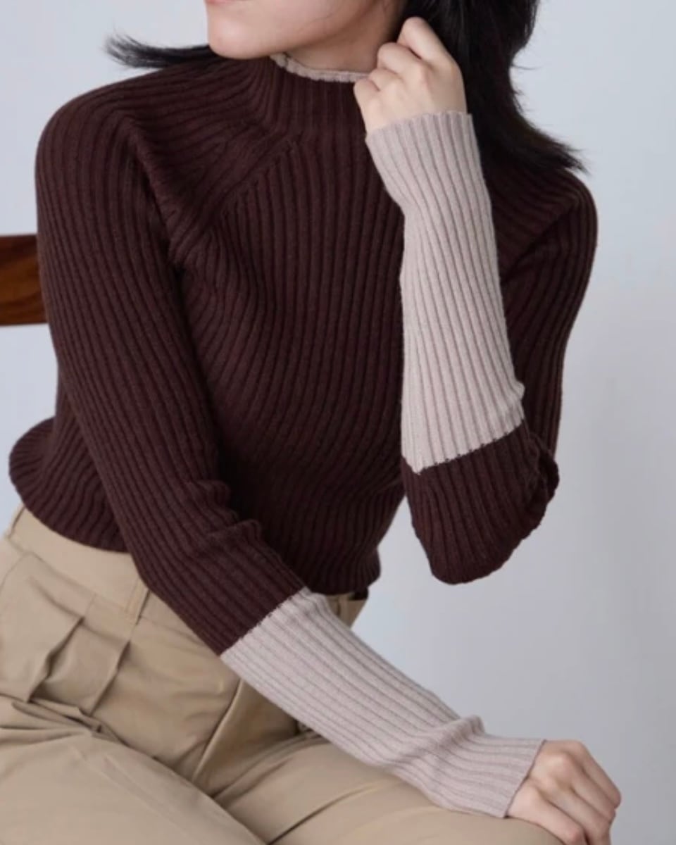 程よいフィット感が女性らしい定番のリブニットに配色デザインをプラスしました。