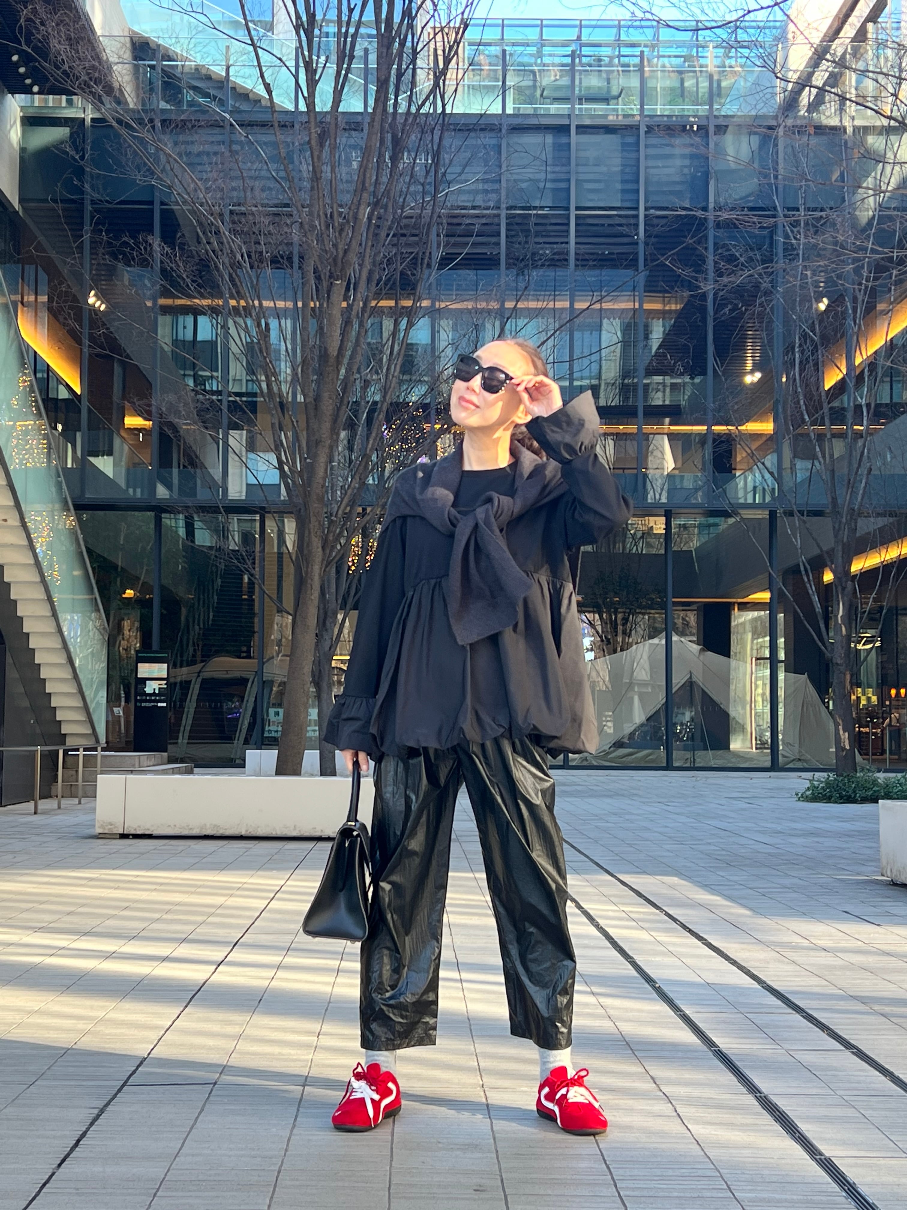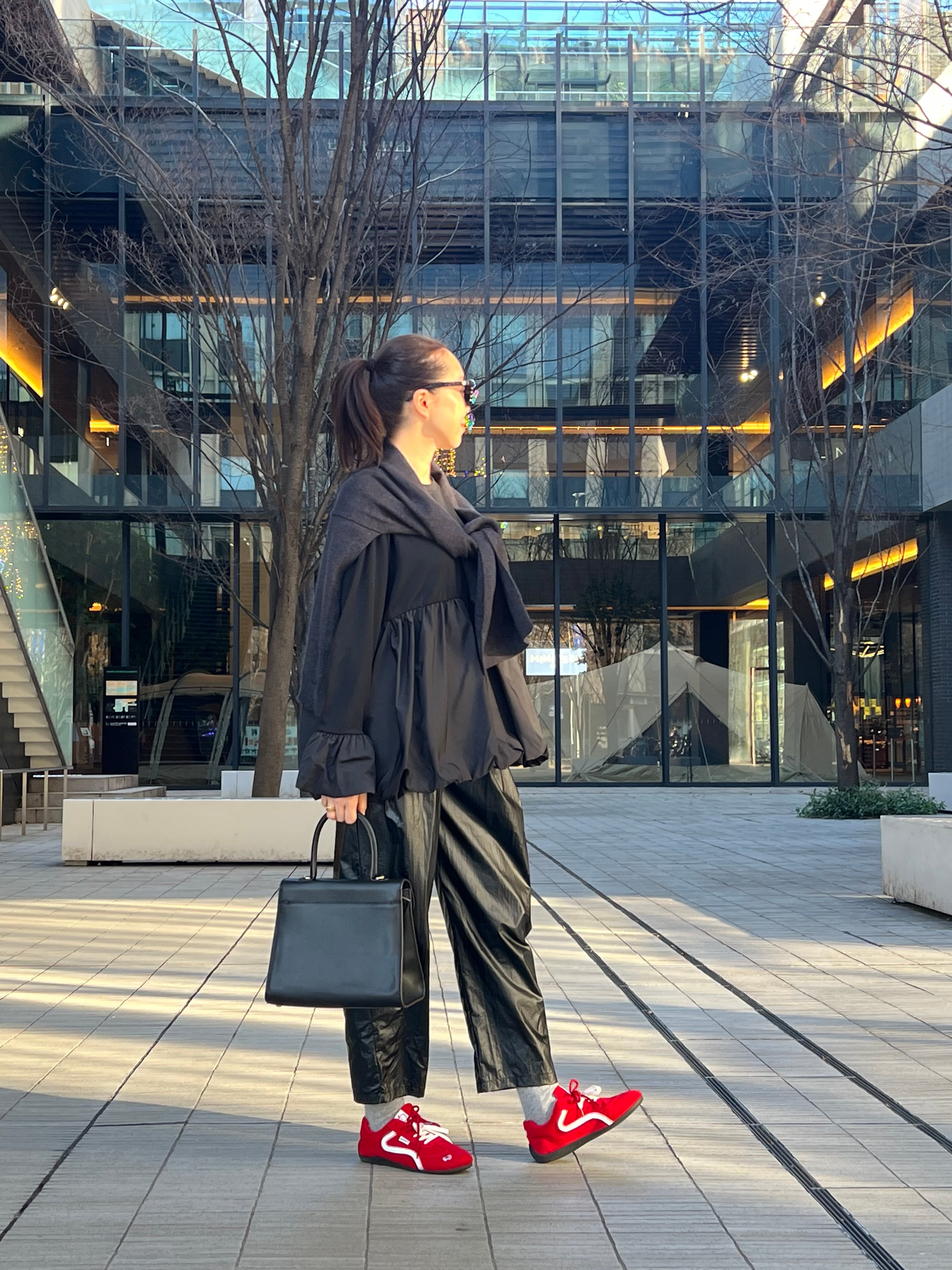 バルーンシルエットの裾がふんわりと広がり、フェミニンな印象を演出します。