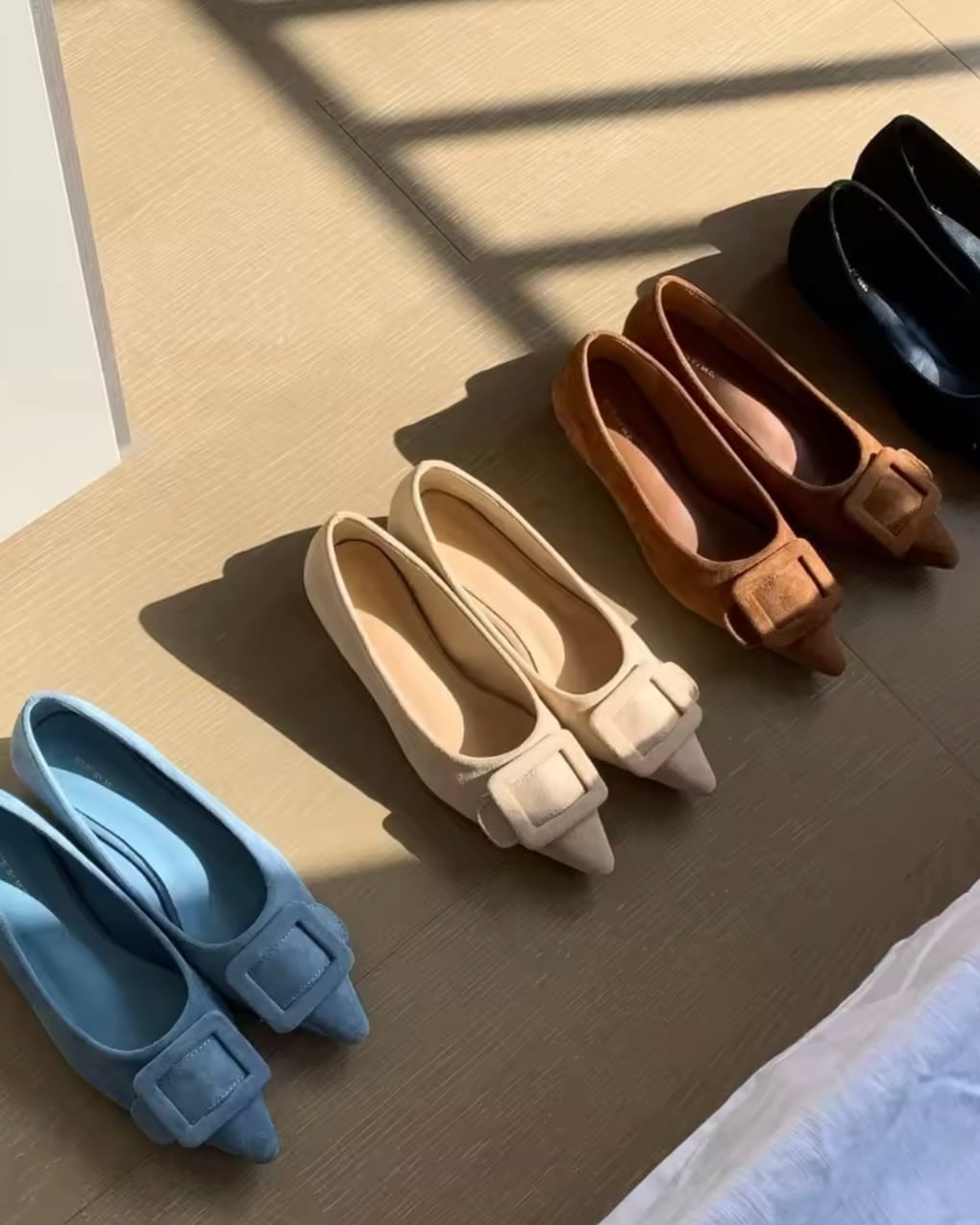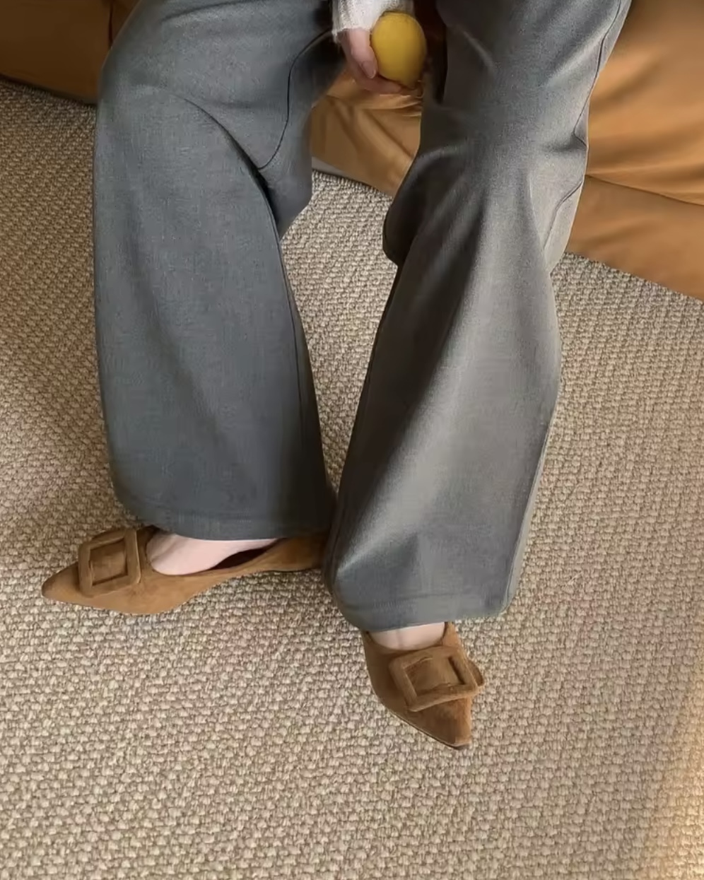 スカートもパンツも合わせやすいスクエアバックルパンプスです。