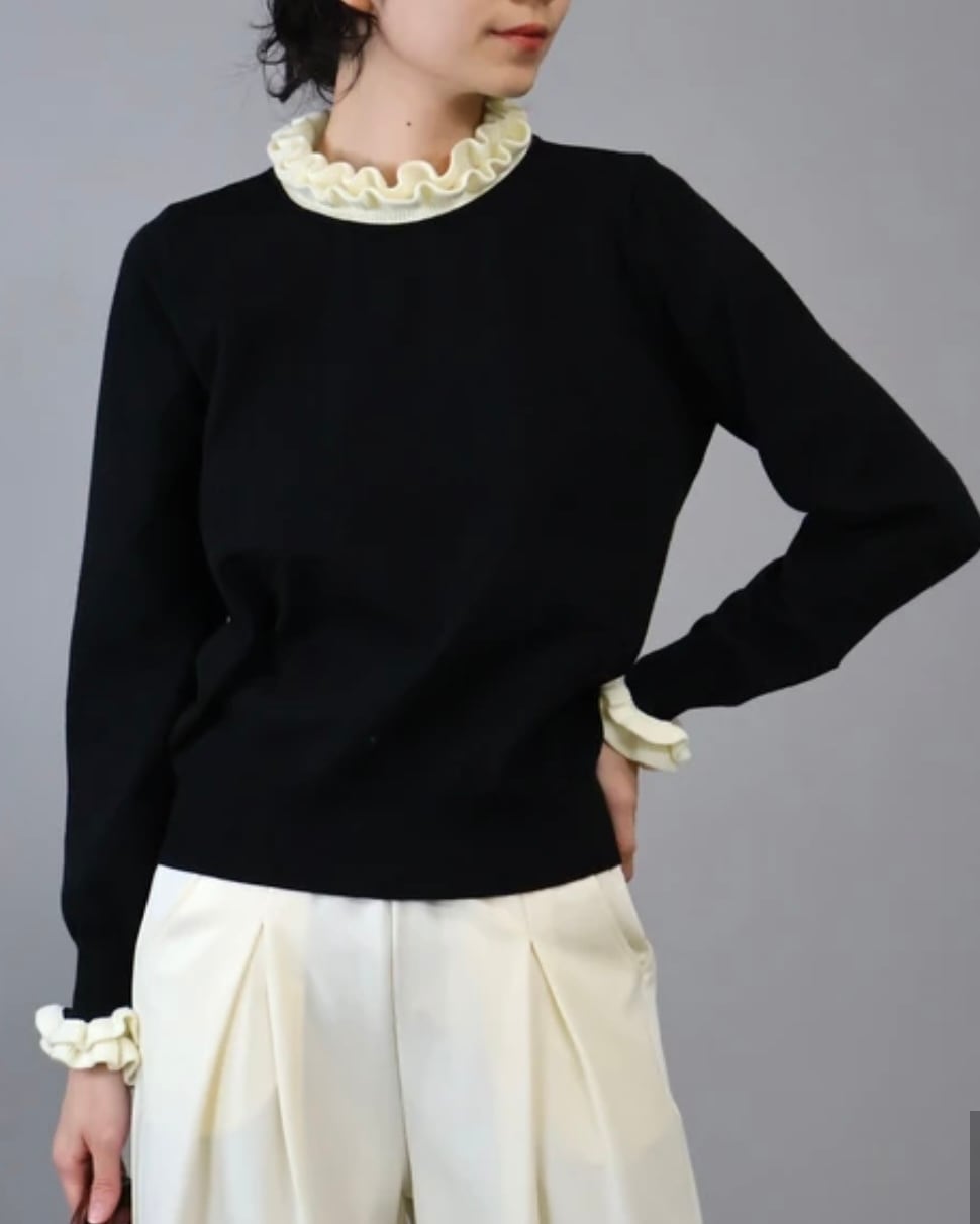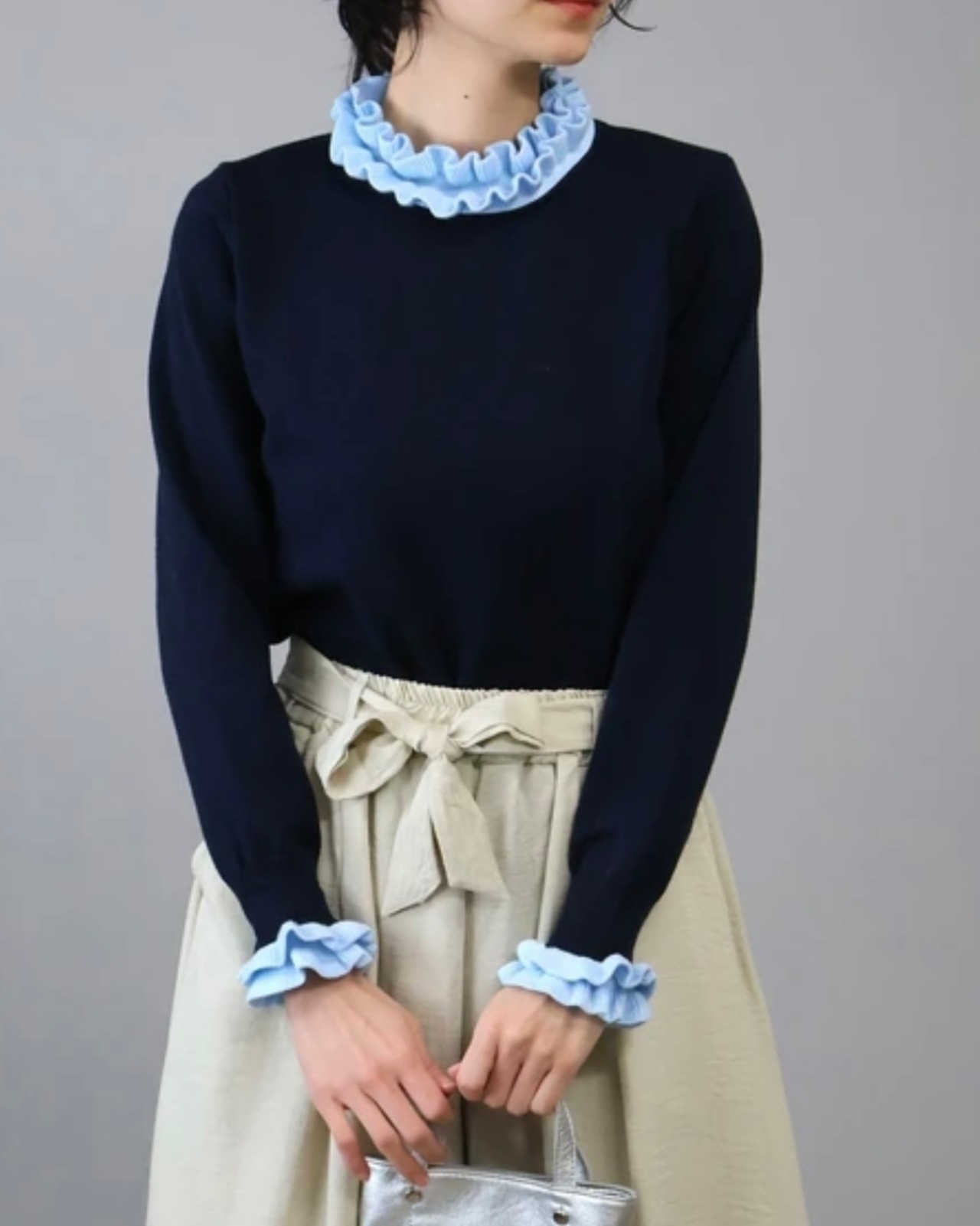首元と袖口のフリルが、シンプルな中に上品な華やかさを添えます。