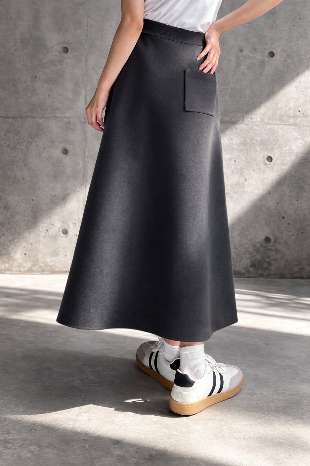 後ろにはポケットが施された大人可愛いシルエット。