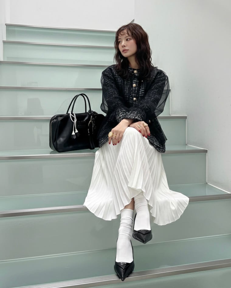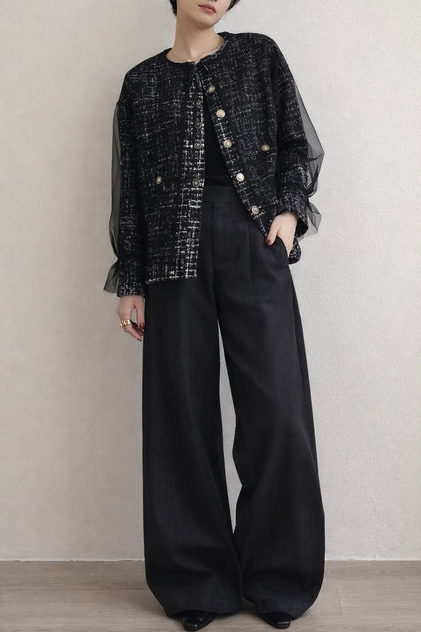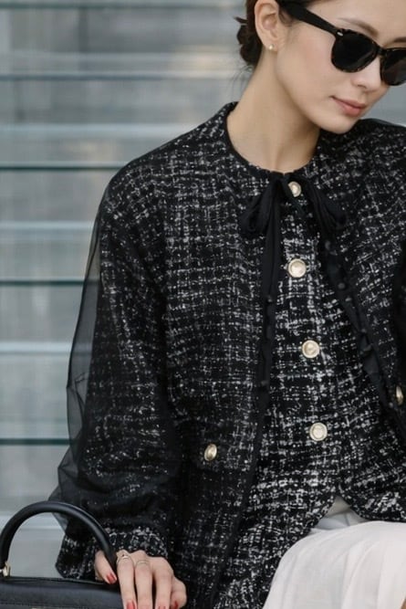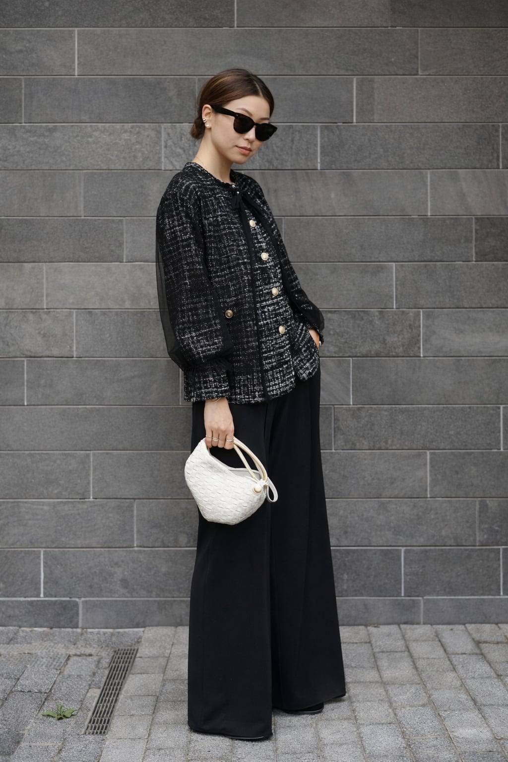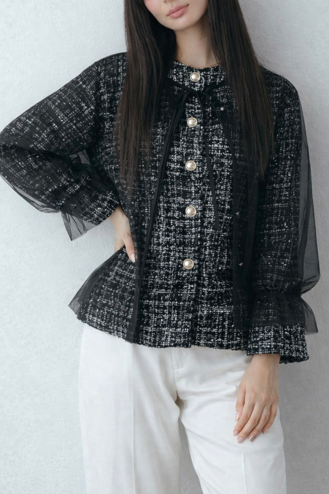 チュールの軽やかさとツイードのクラシックな風合いが調和された逸品!インナーのみ裏地付きです!!