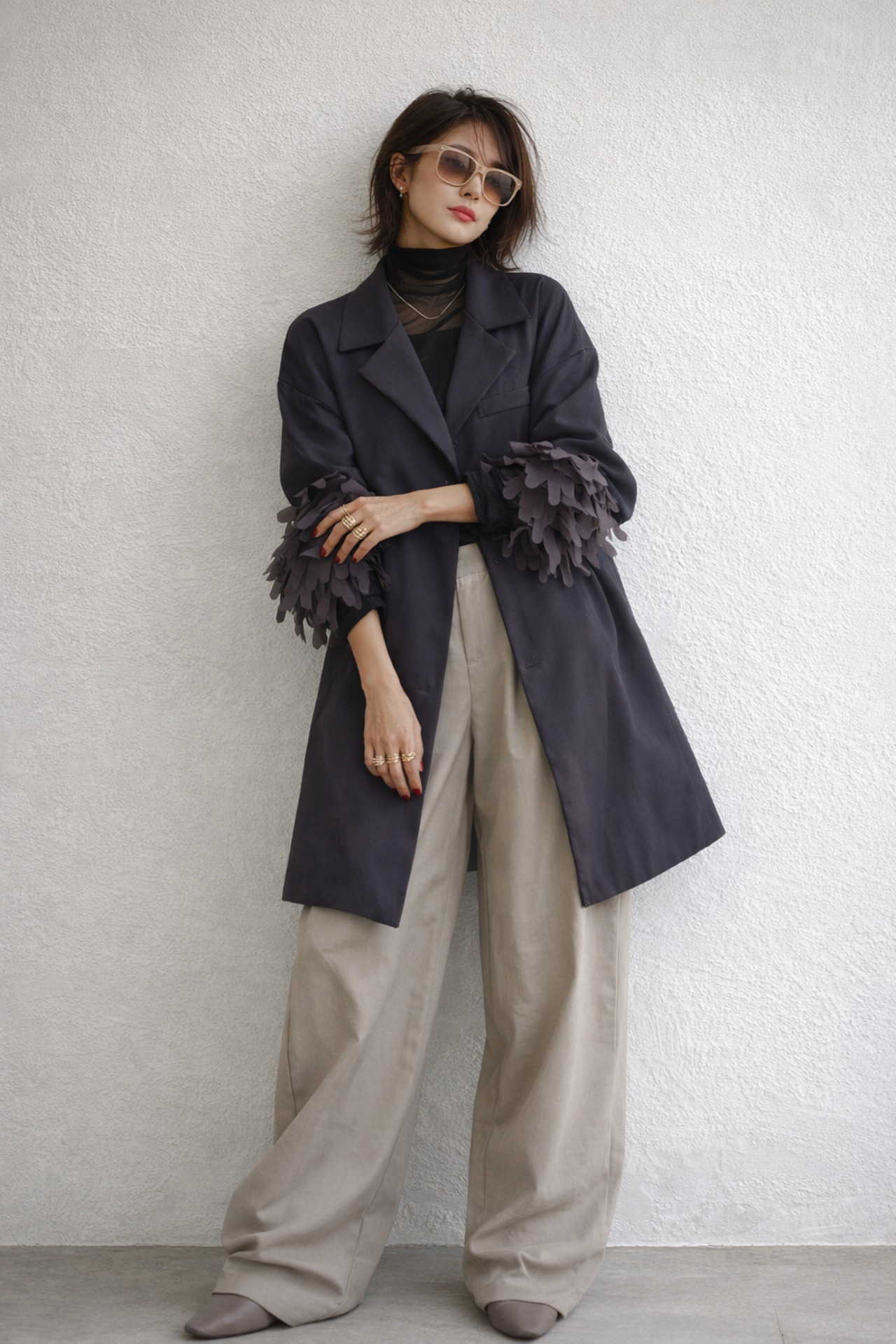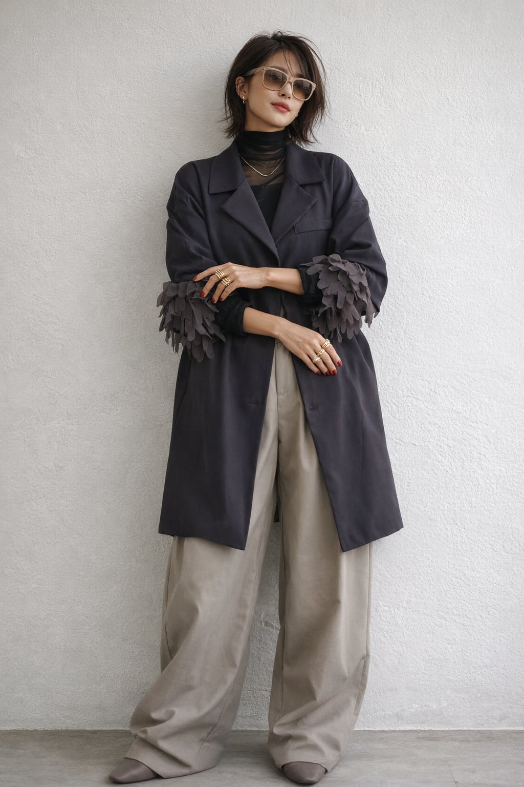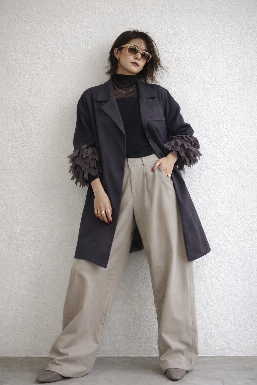袖口のフリルデザインが特徴的なライトアウター。 ドロップショルダーとややオーバーシルエットでカジュアルさと抜け感をプラス。