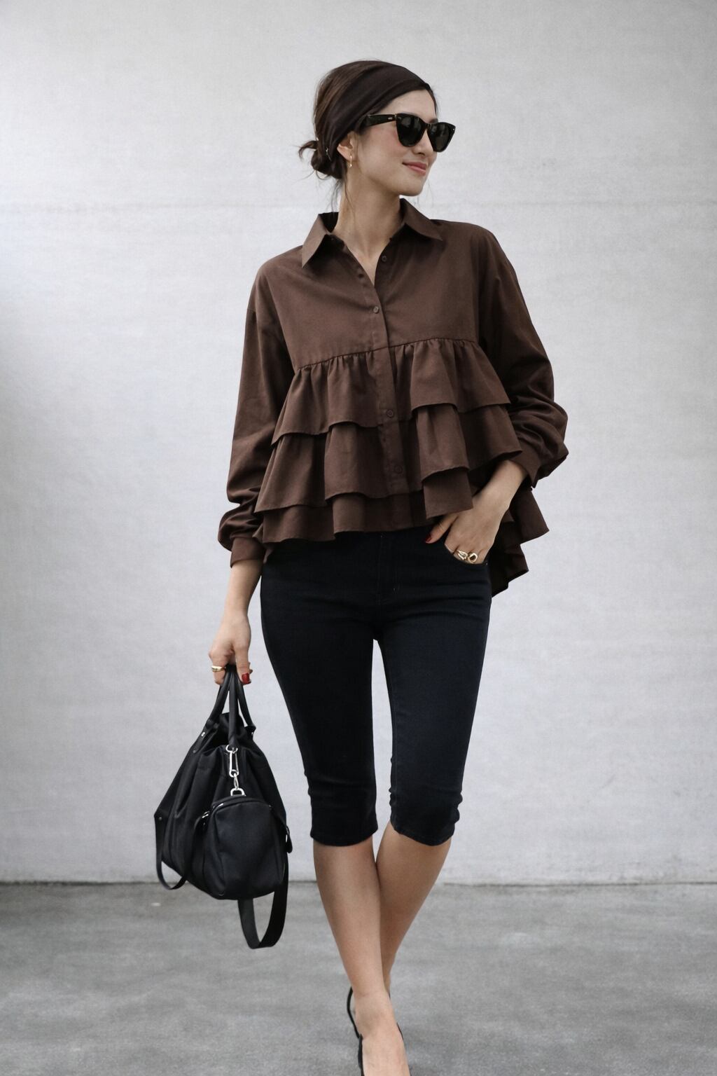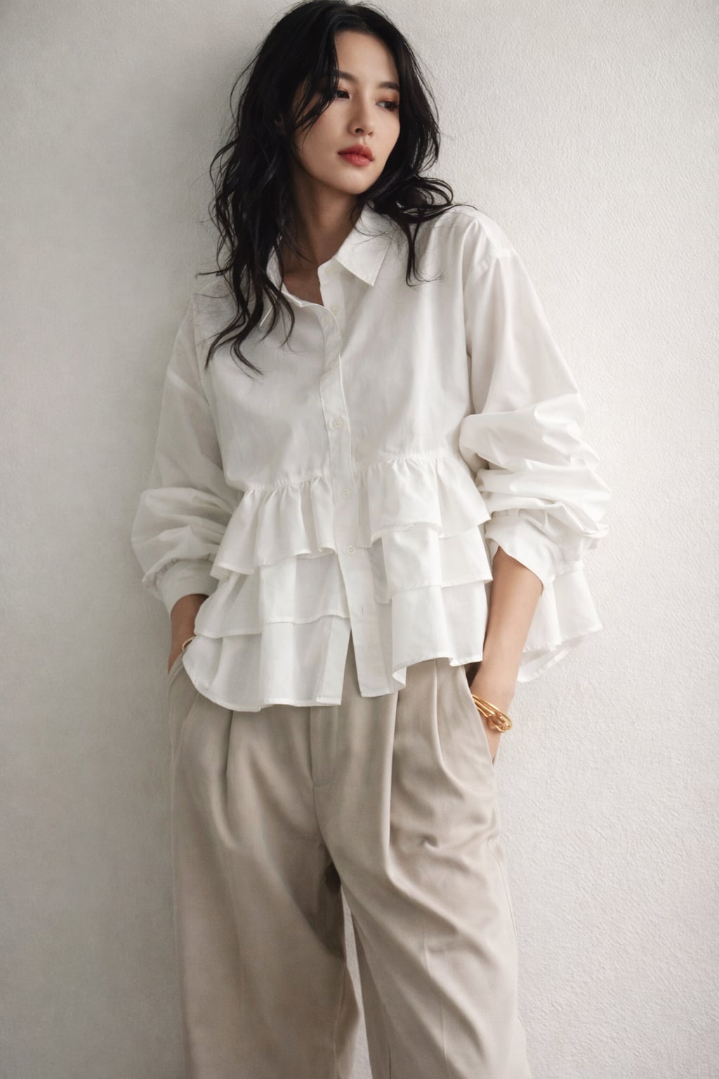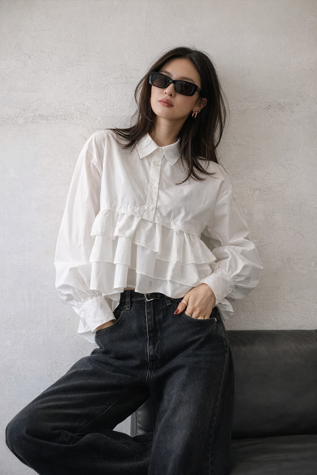 ティアードデザインが目を惹く、ブロード素材のフリルシャツ。