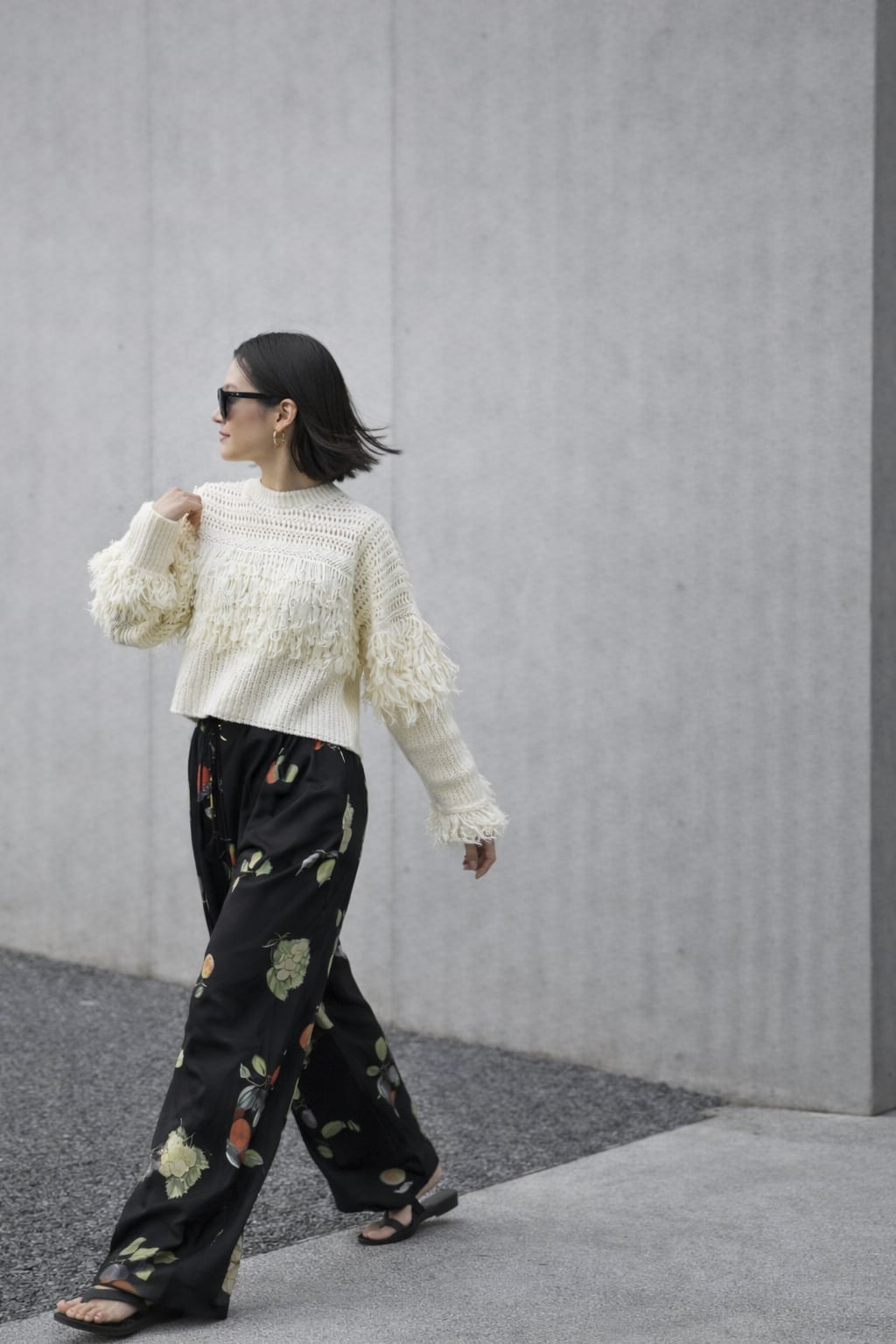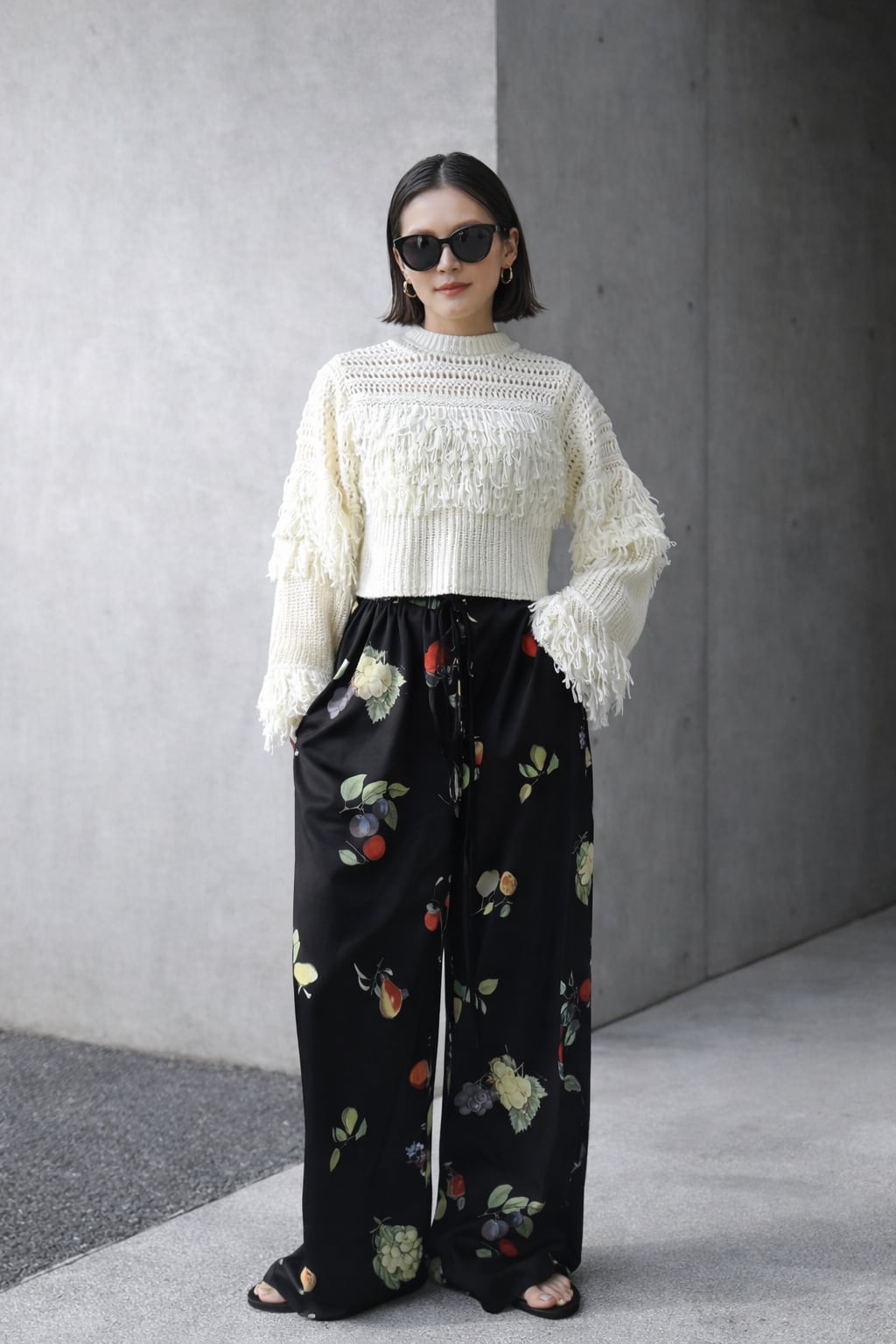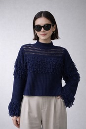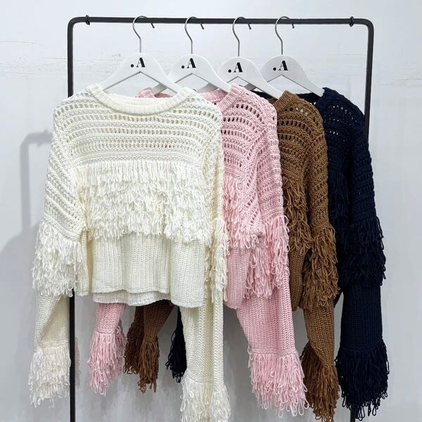 メッシュ編みとフリンジ切替を組み合わせた、表情のあるニットプルオーバー