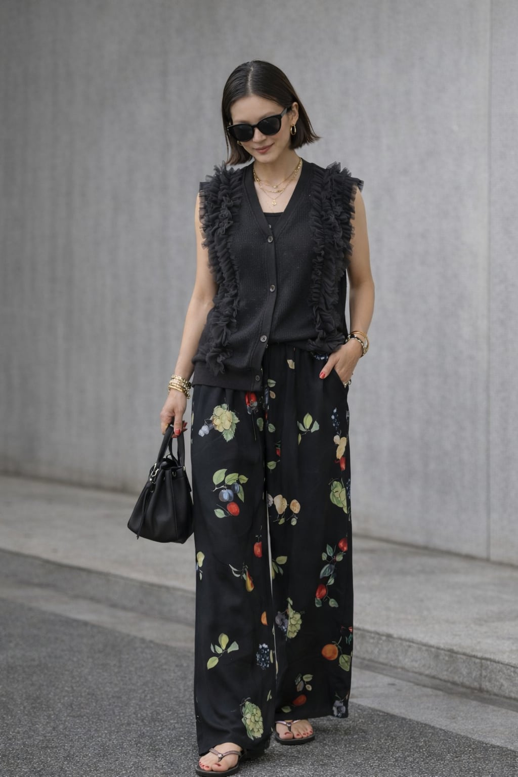 広がりすぎないシルエットで、柄物でも大人っぽく着こなせます。