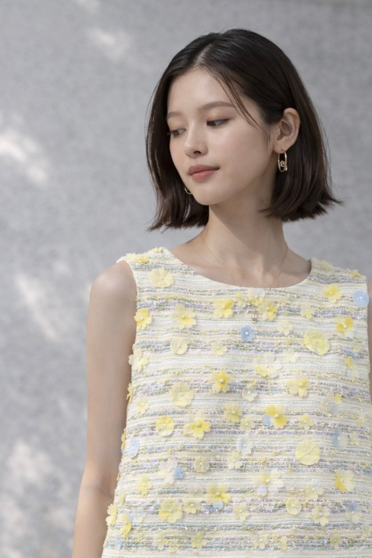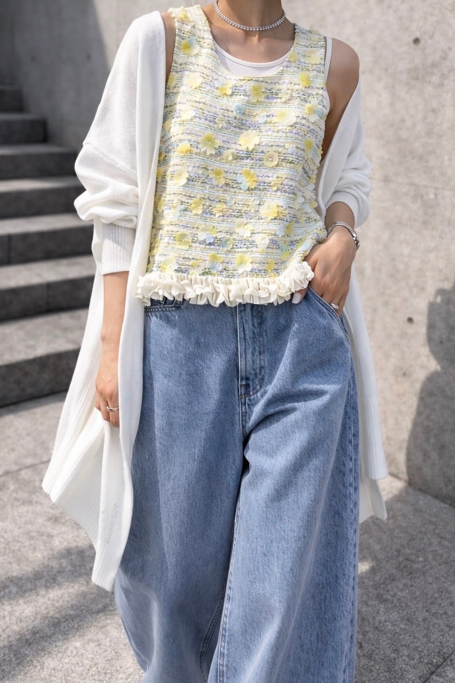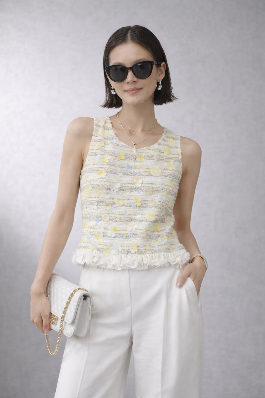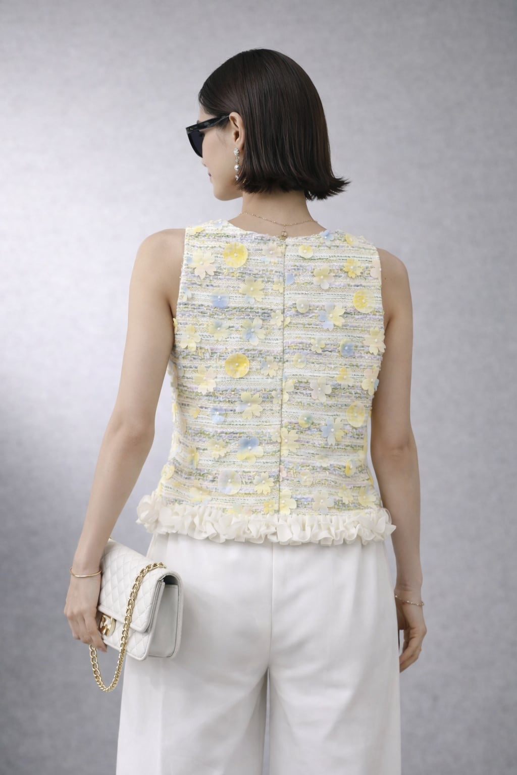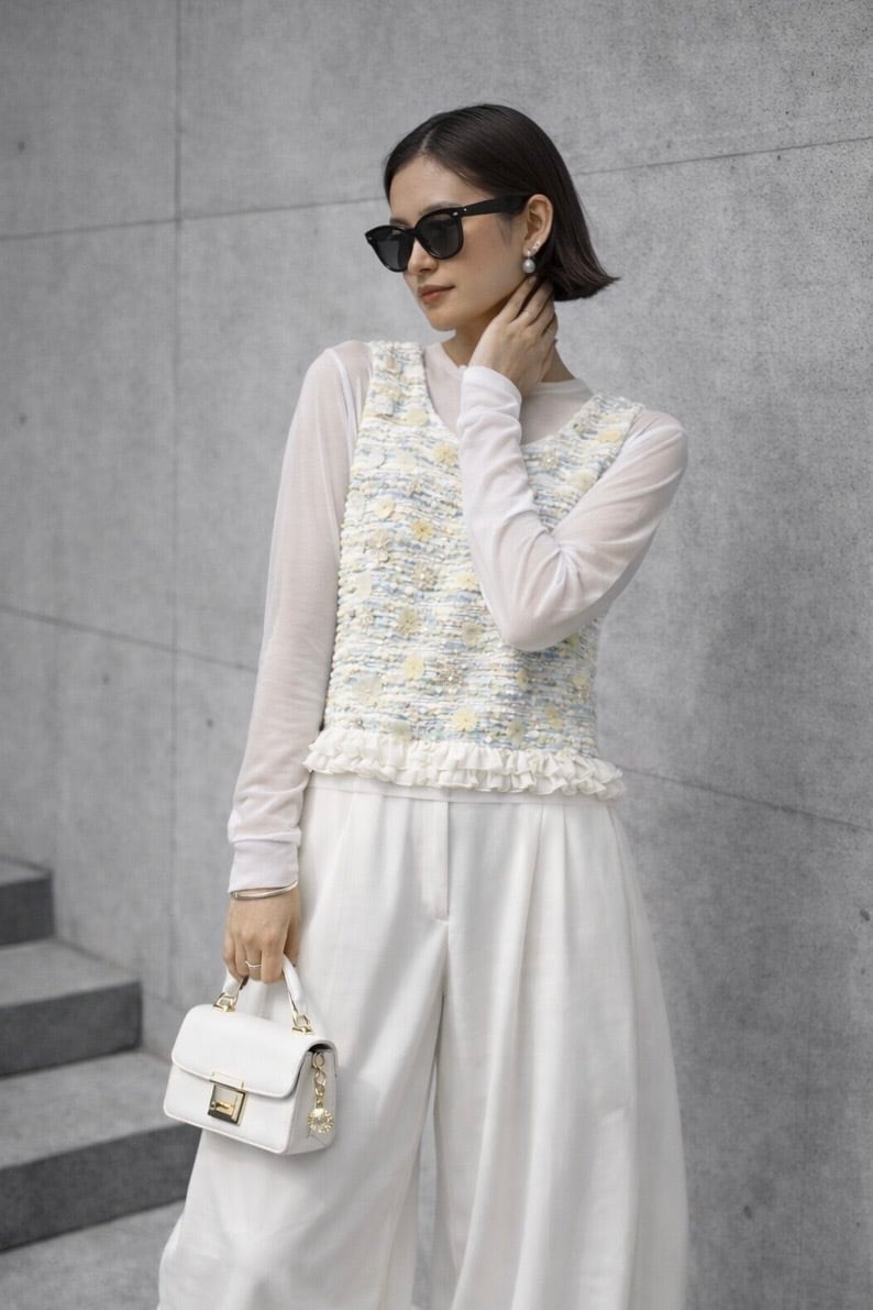 フラワーモチーフ付きのツイードデザインベスト