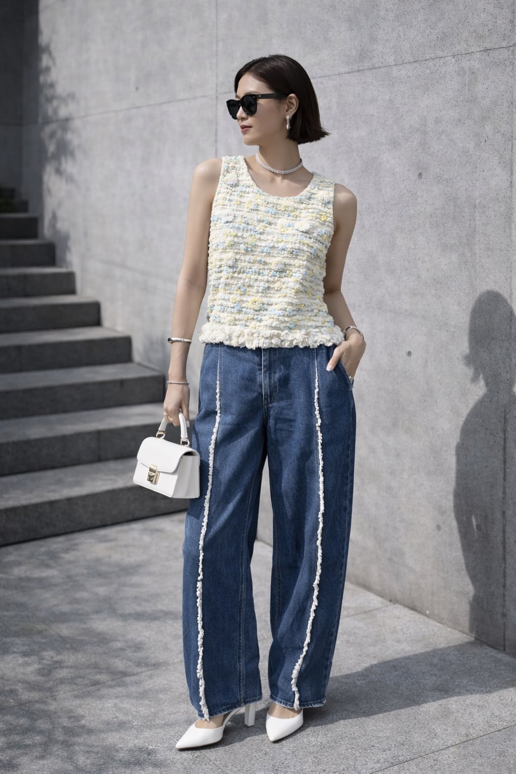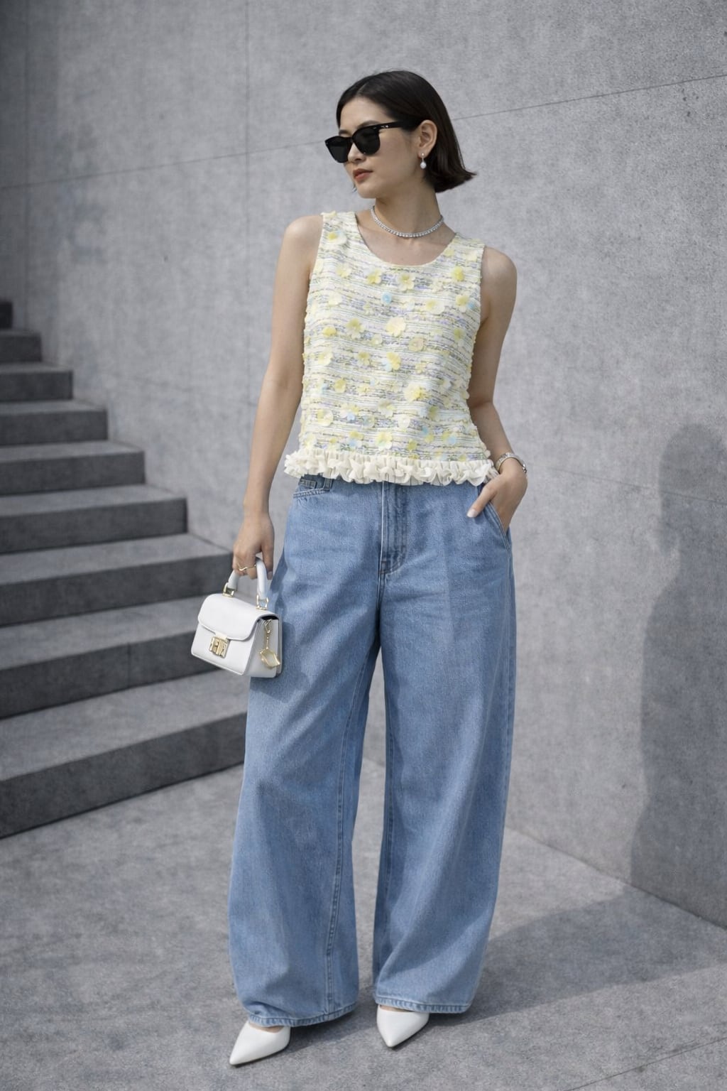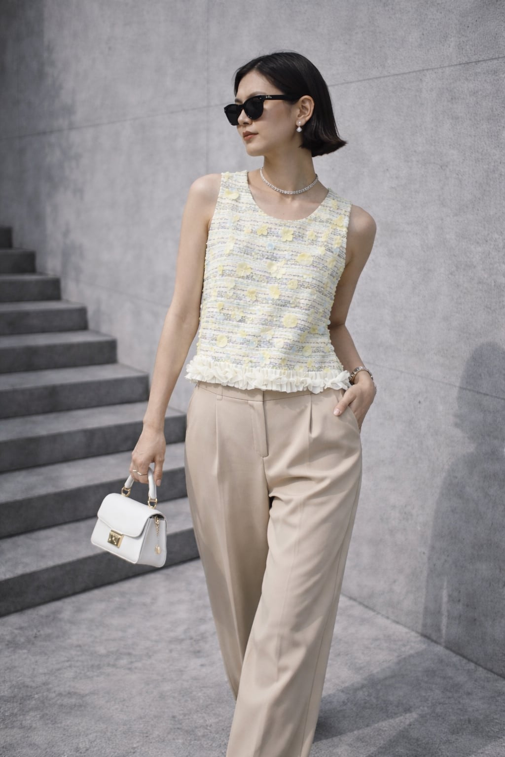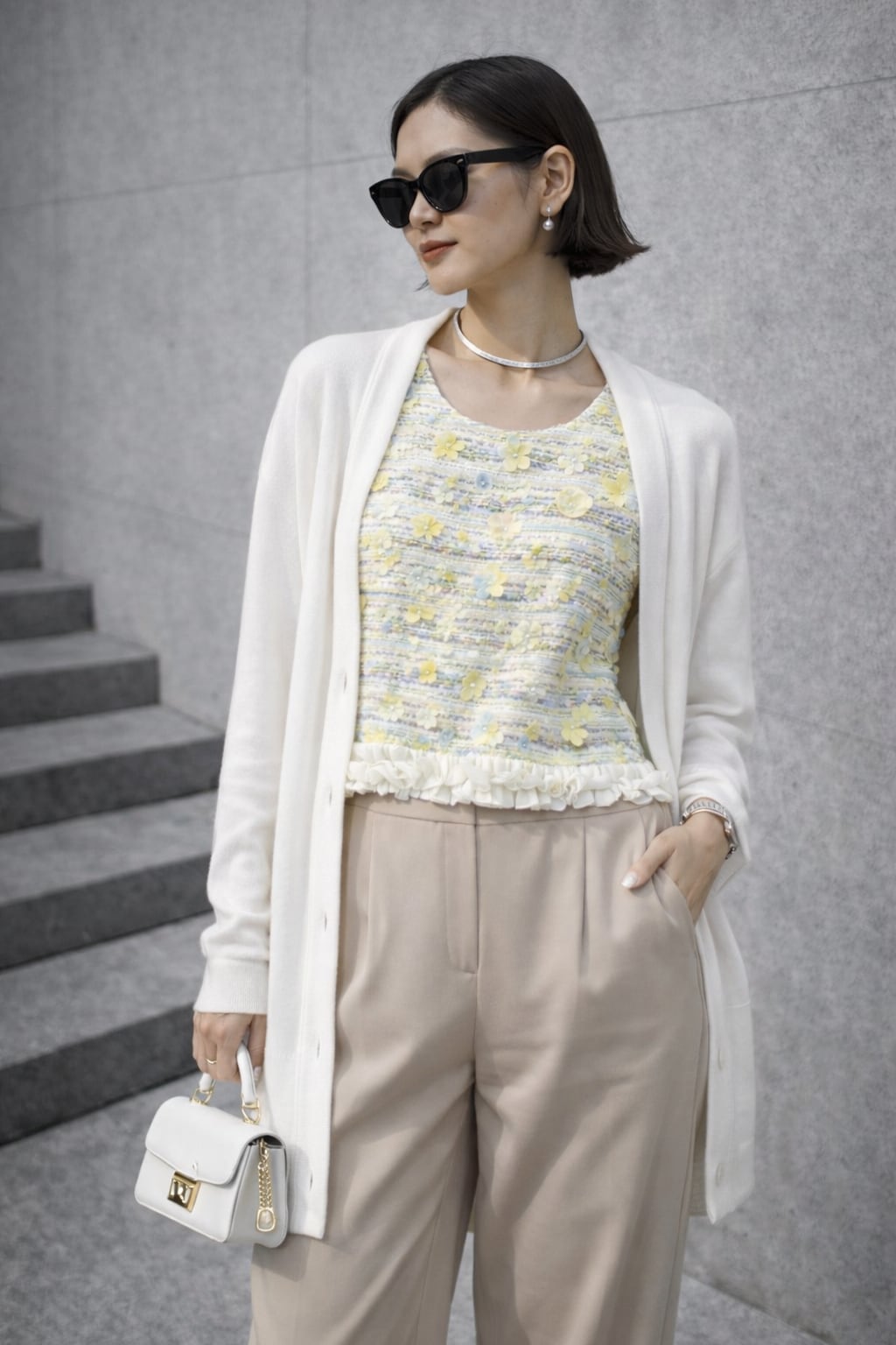 フラワーモチーフ付きのツイードデザインベスト