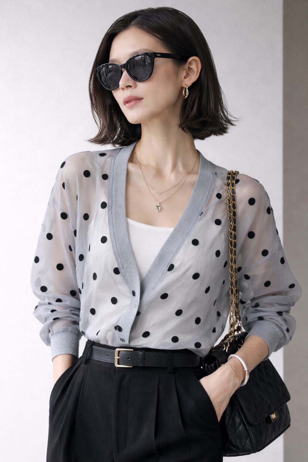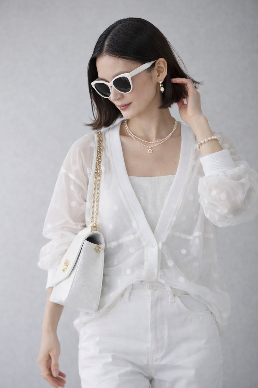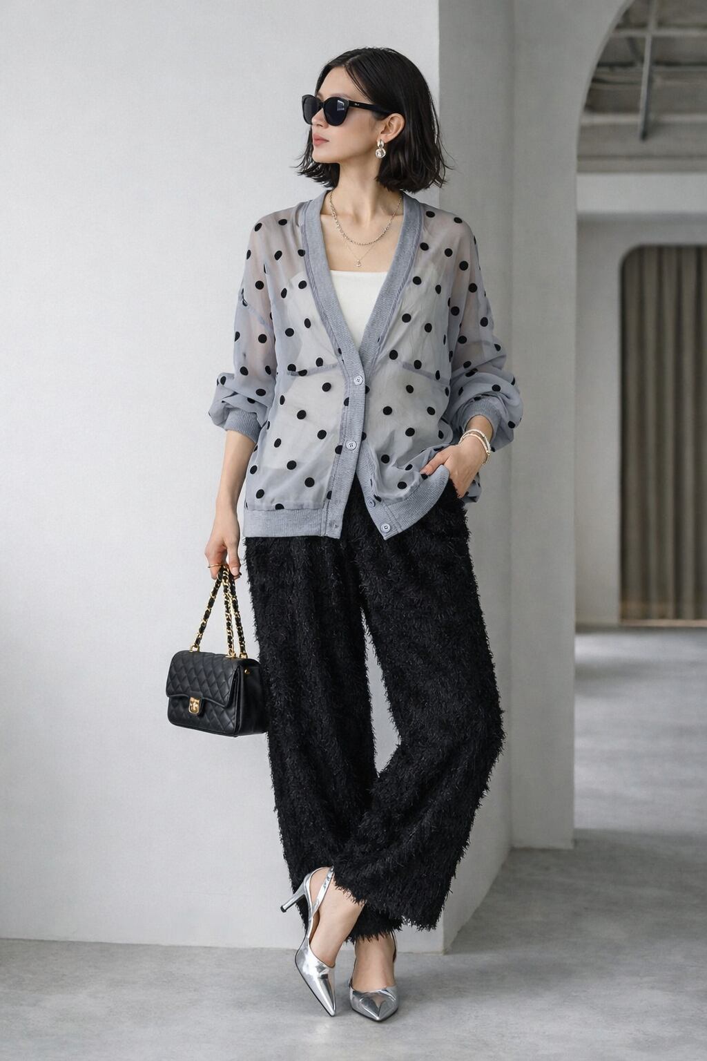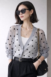 軽やかな透け感と、表情のあるフロッキードットが目を惹くVネックカーディガン
