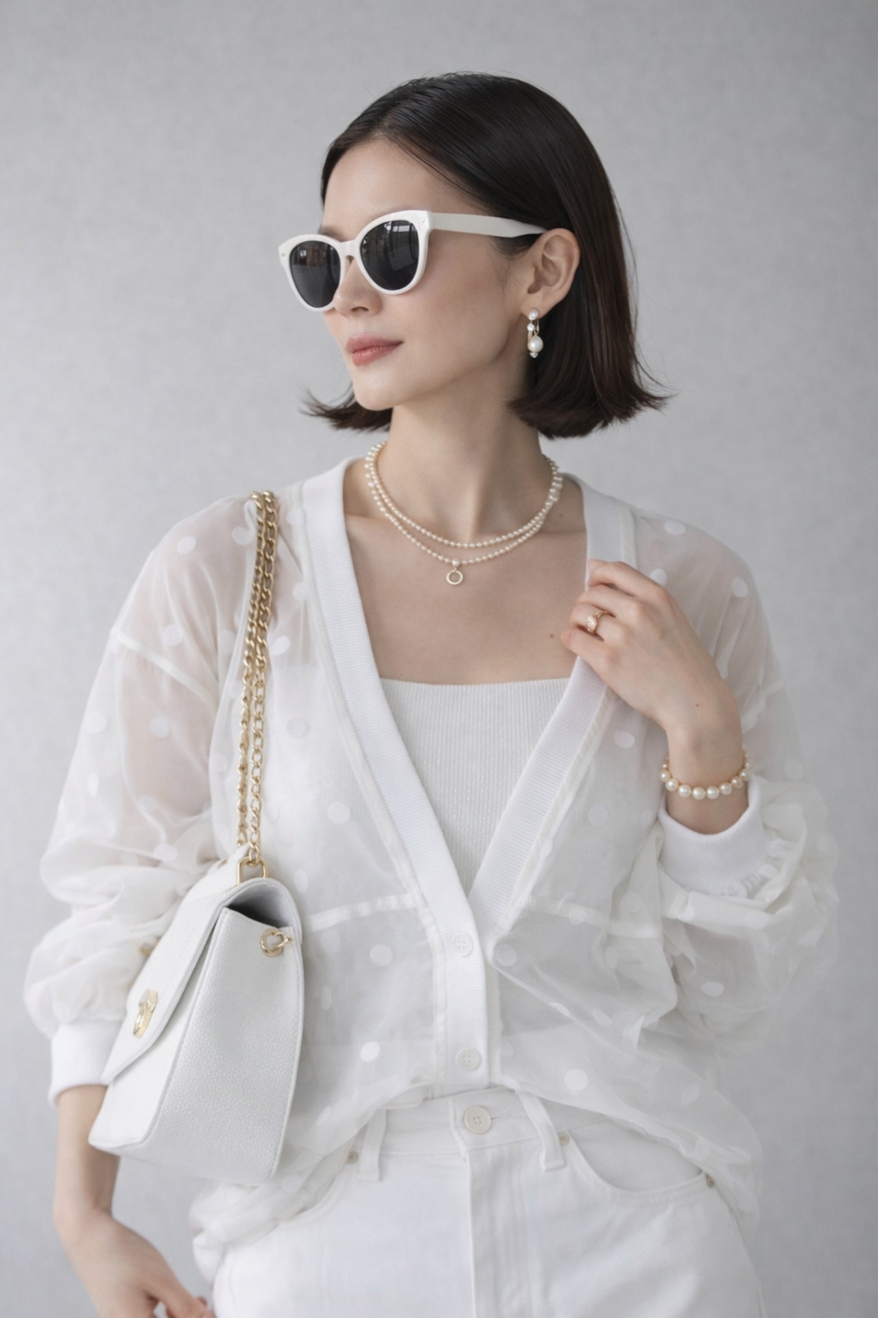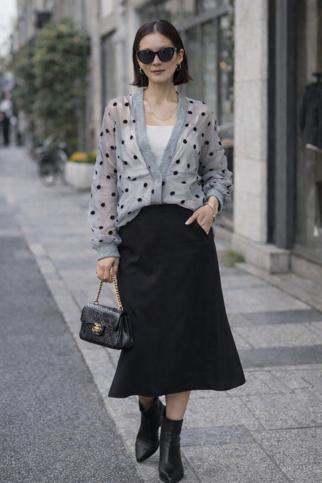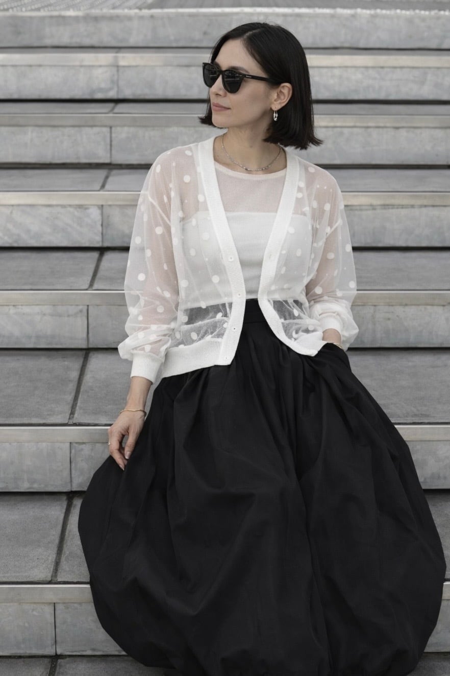 軽やかな透け感と、表情のあるフロッキードットが目を惹くVネックカーディガン