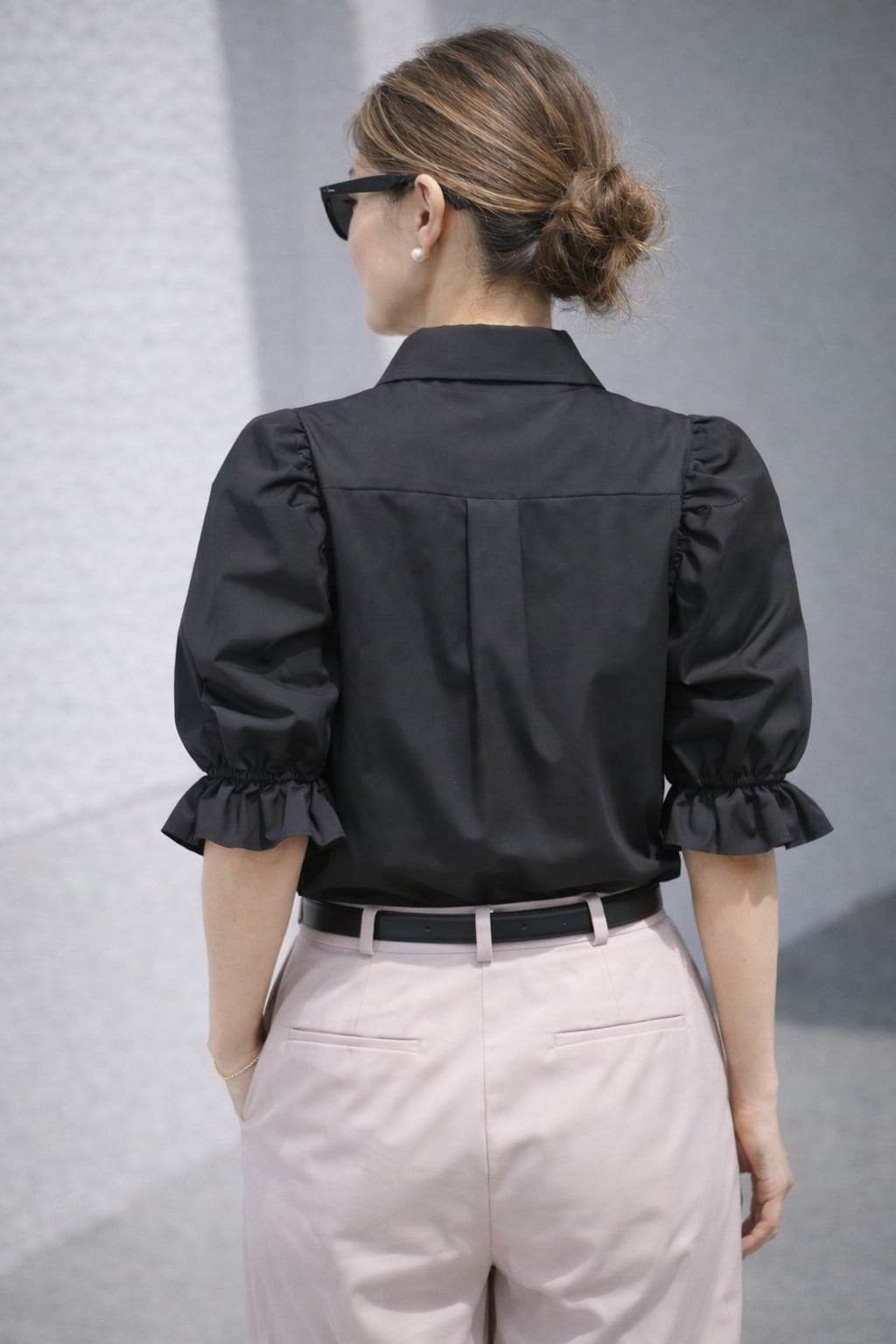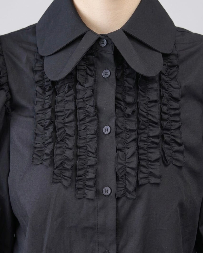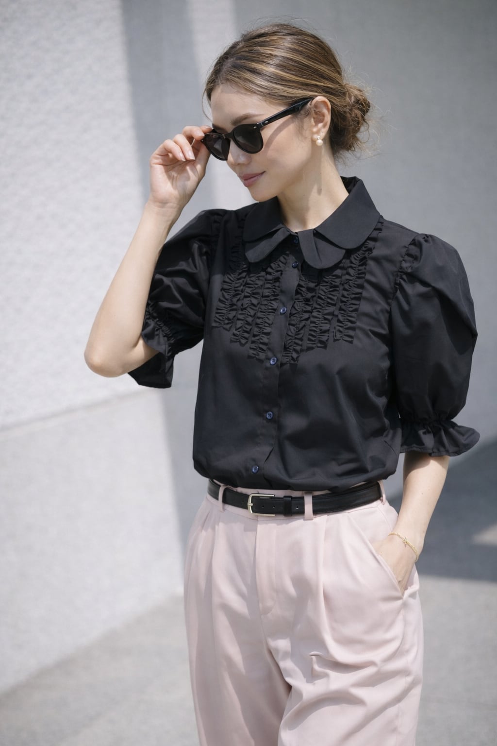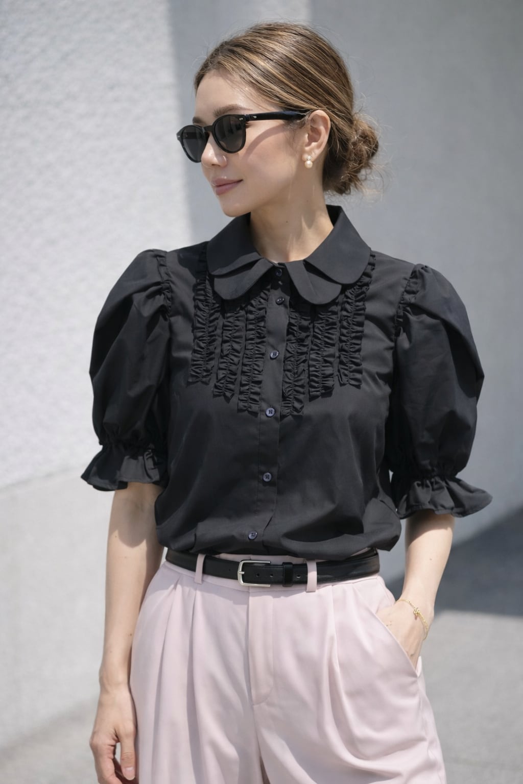 ボリューム袖、胸元のフリルが華やかで女性らしさを引き立たせます。