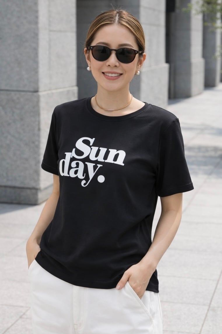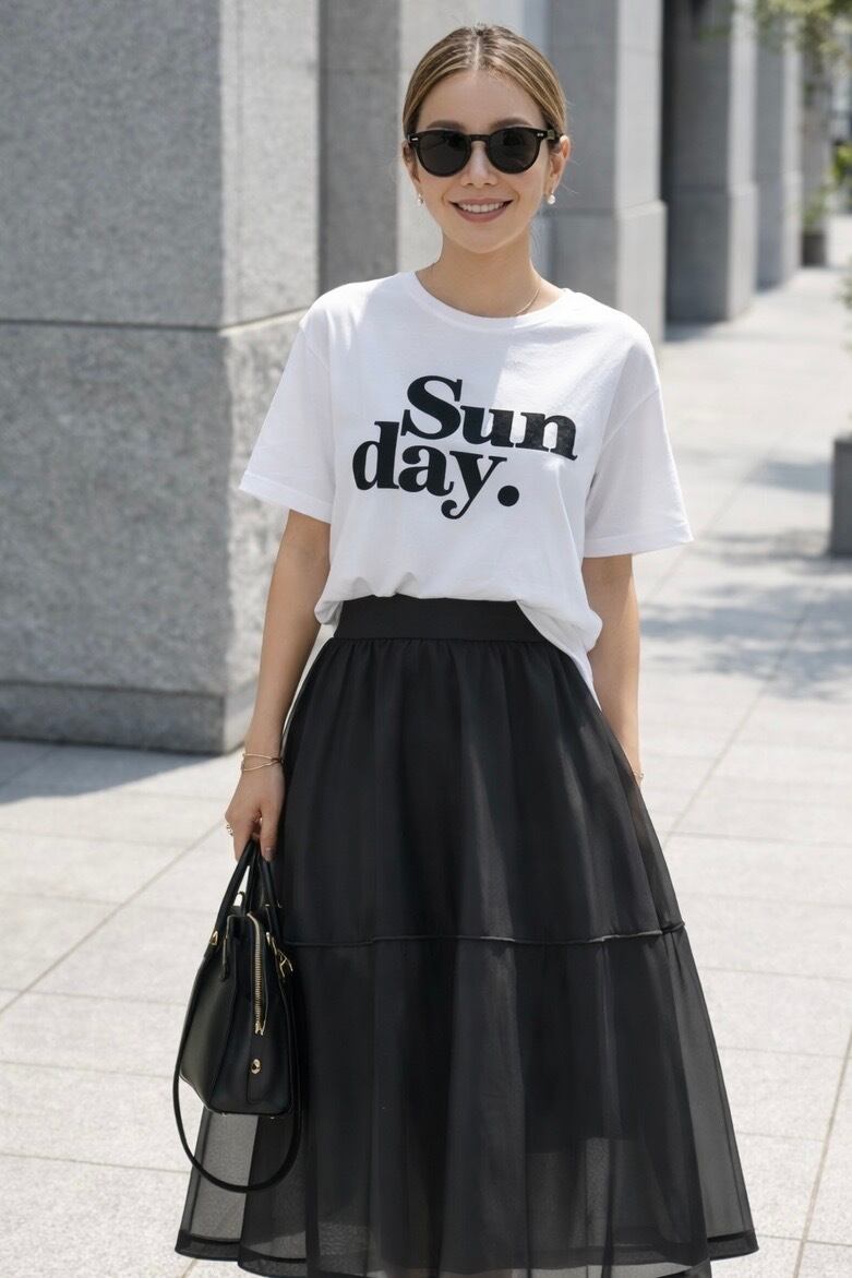 大きめのロゴはカジュアルになりがちですが、フロッキー生地で仕上げることで大人っぽい表情に。