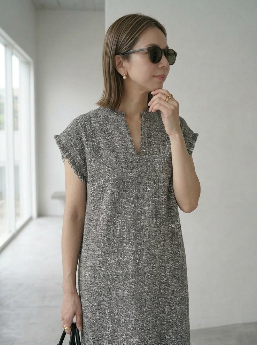 ツイード素材で高級感があり、タートルニットや春先にはシアートップスなどレイヤードして着ればこなれたスタイリングに。