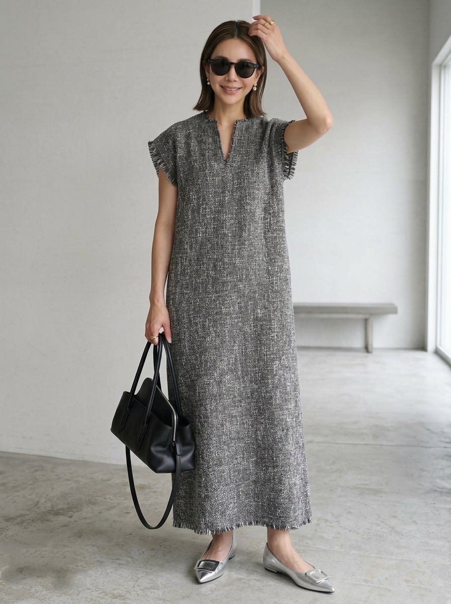 シンプルながらも着映えするコーデの主役級ワンピースです。