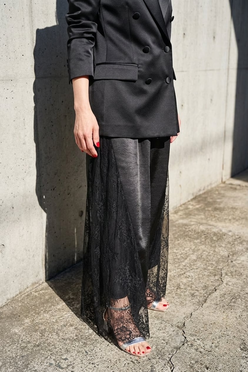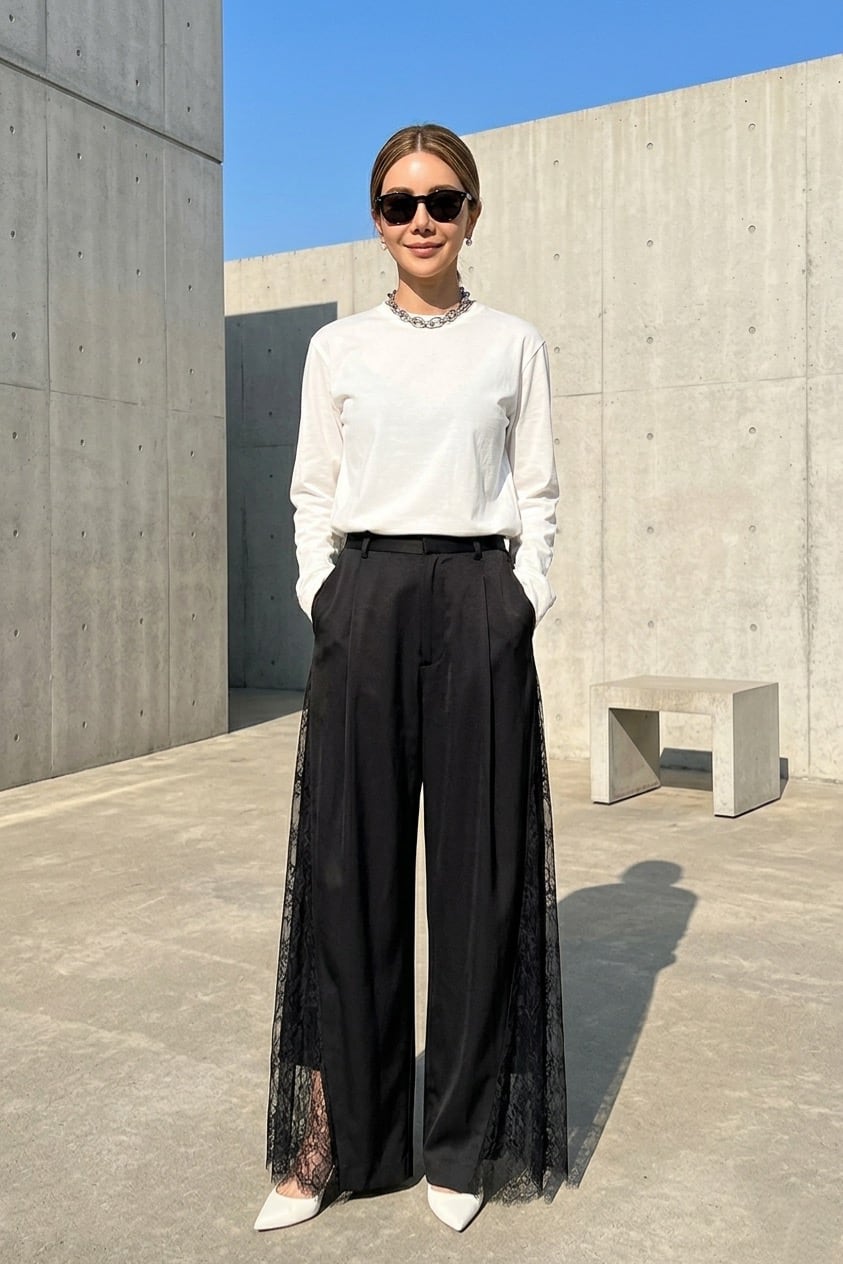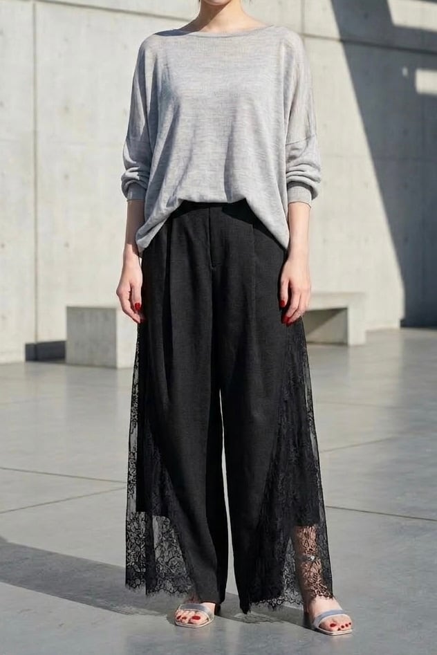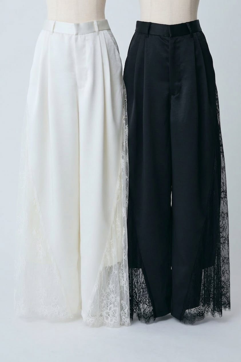 サイドの繊細なレースが、歩くたびにドラマチック。上品な透け感とワイドシルエットで、モードな装いに