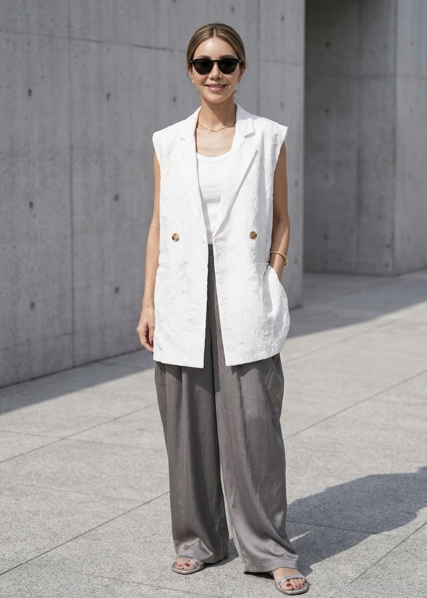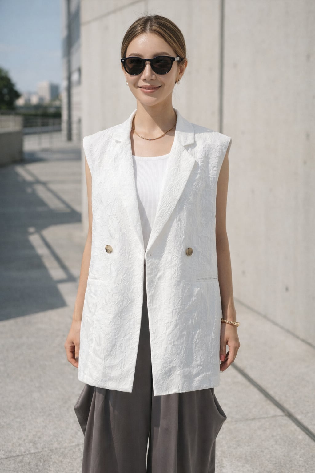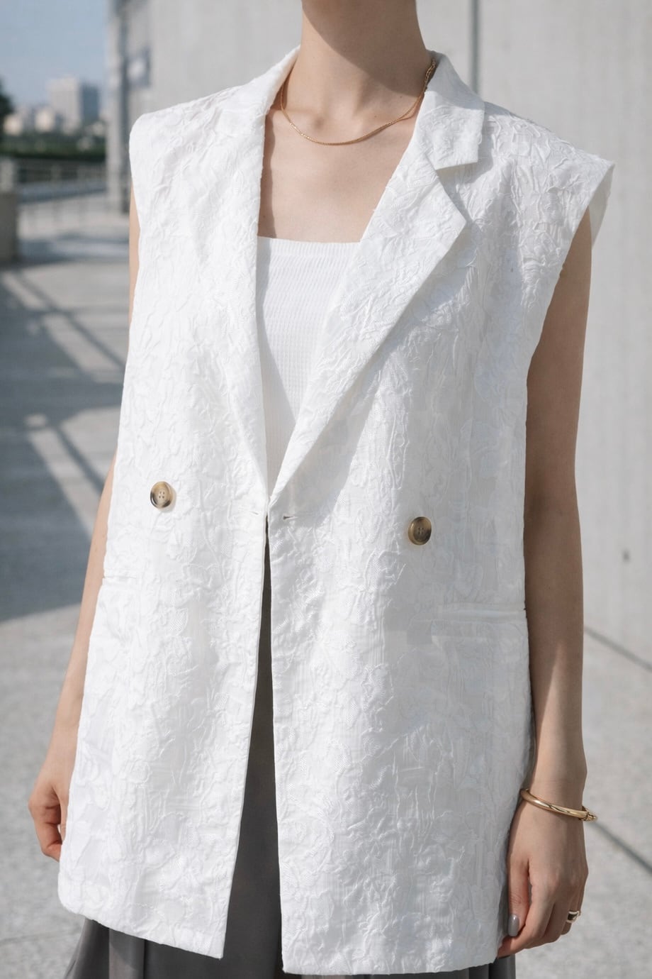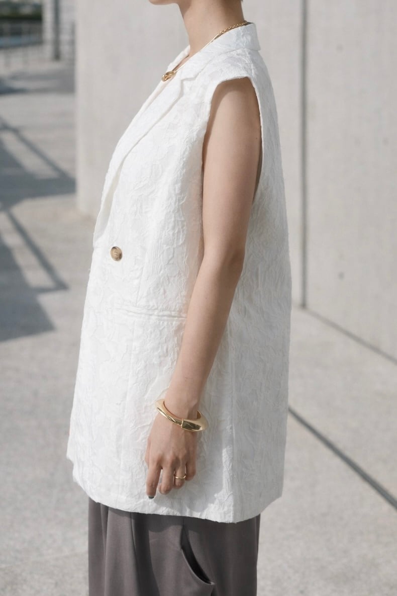 繊細なジャガード柄とシアー素材が絶妙にマッチしたテーラードジレ。