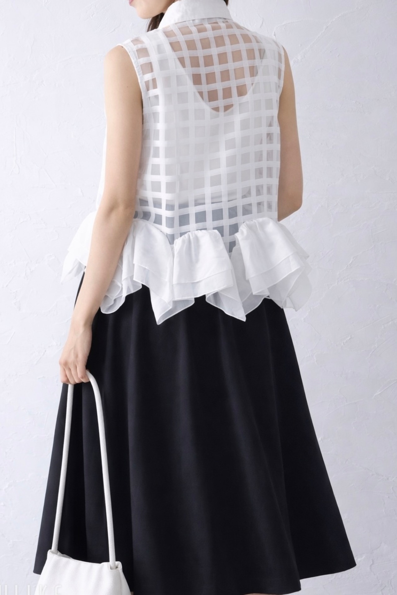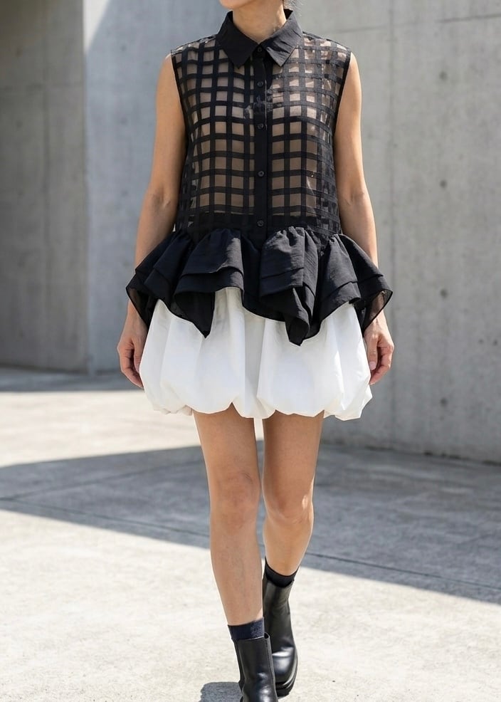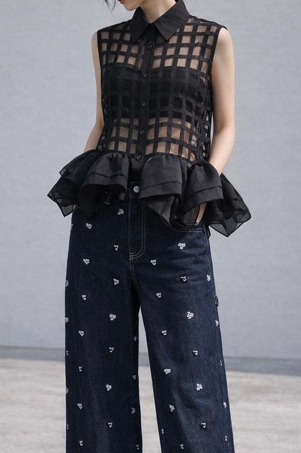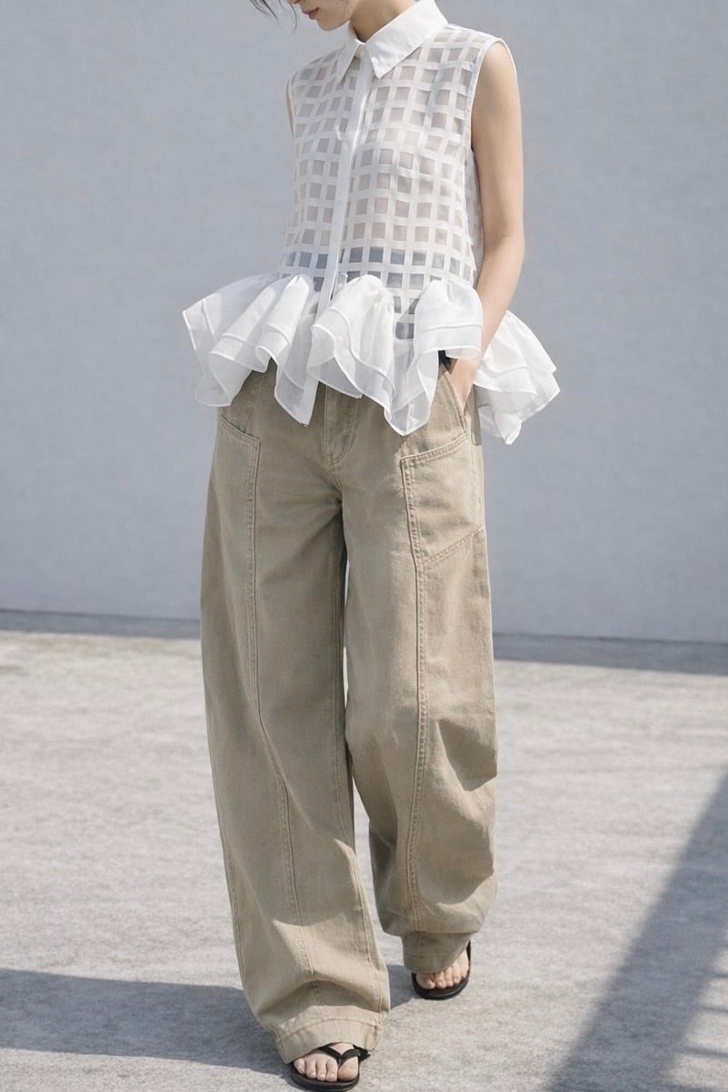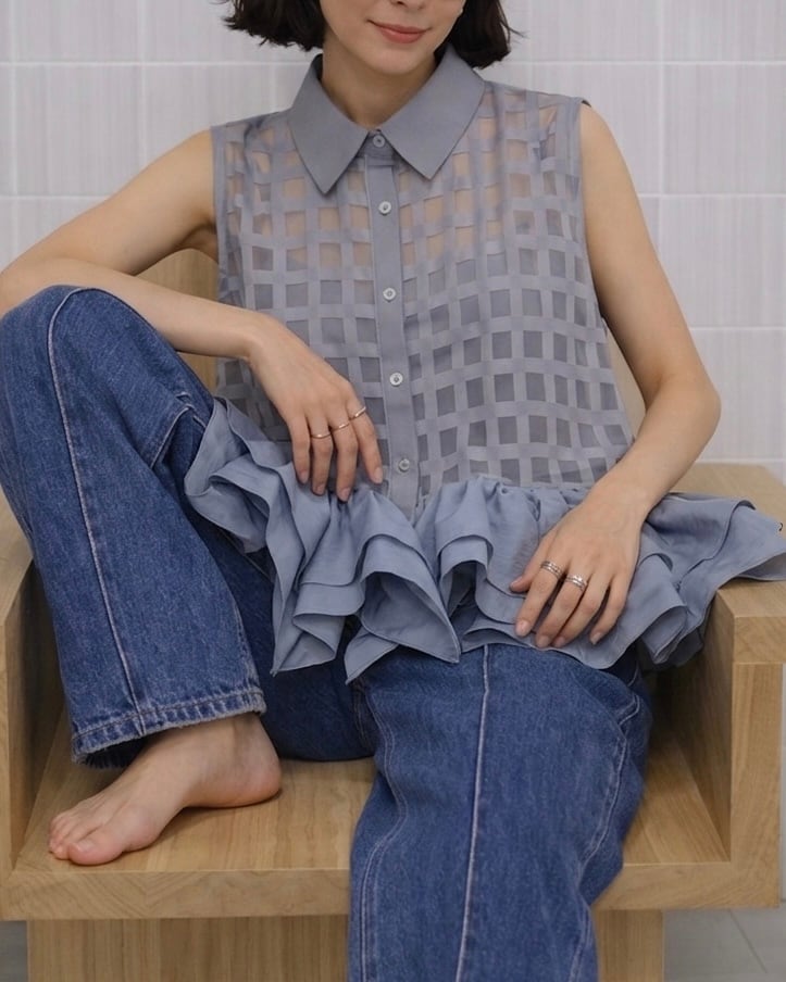 裾のフリルが特徴のシアーベストトップス