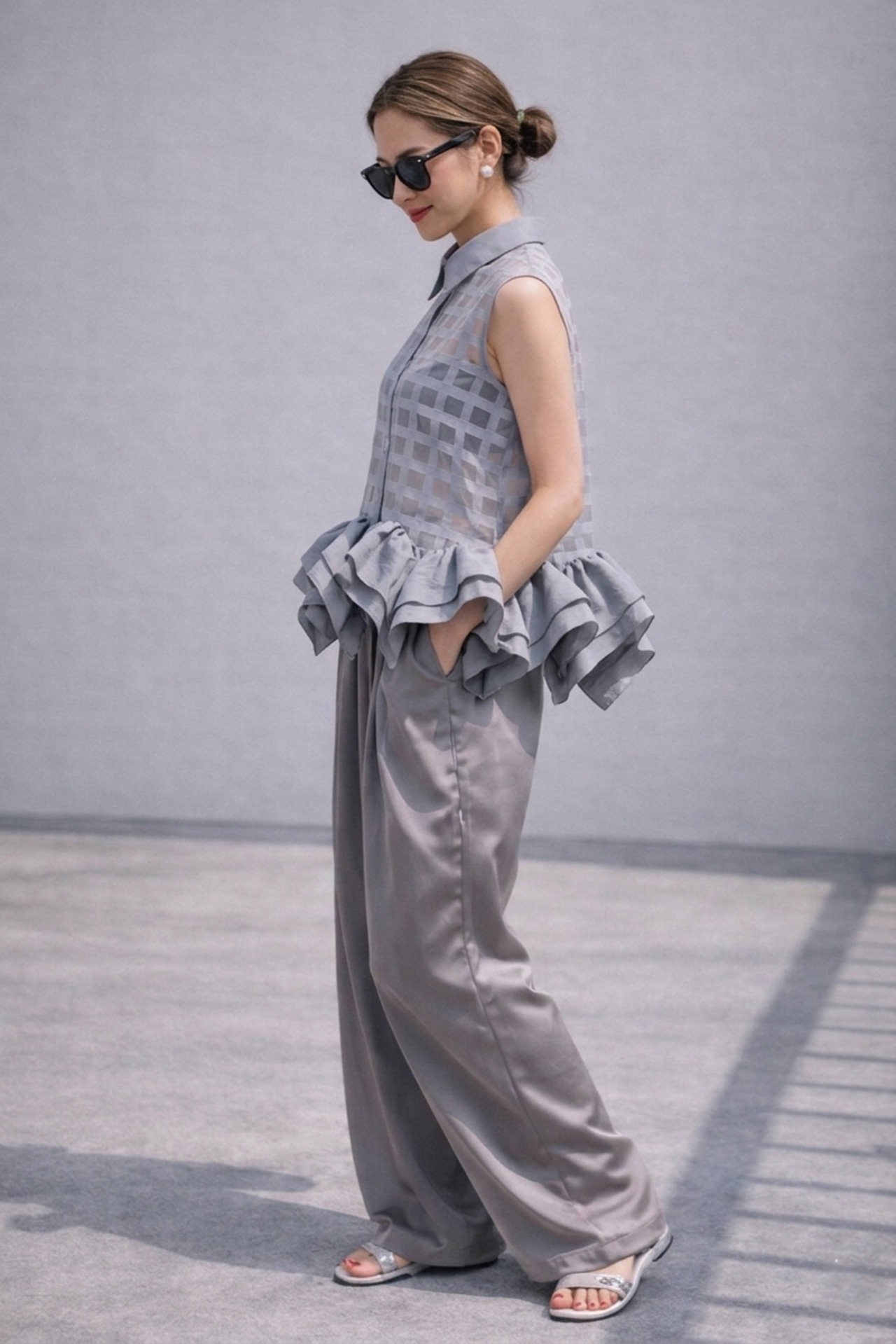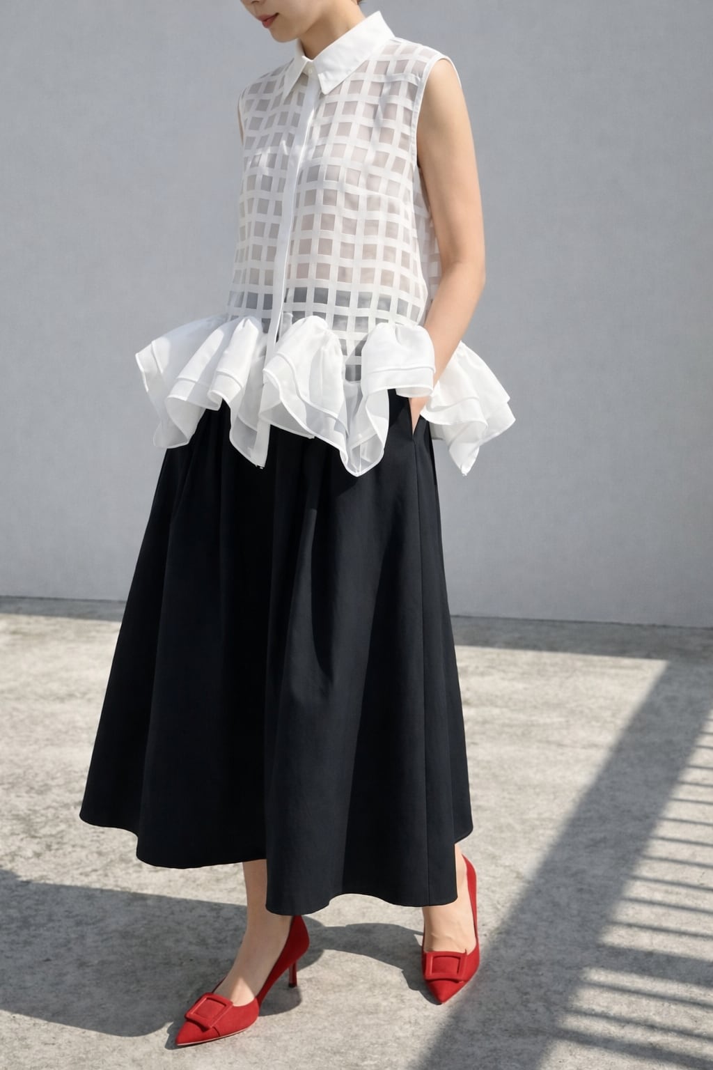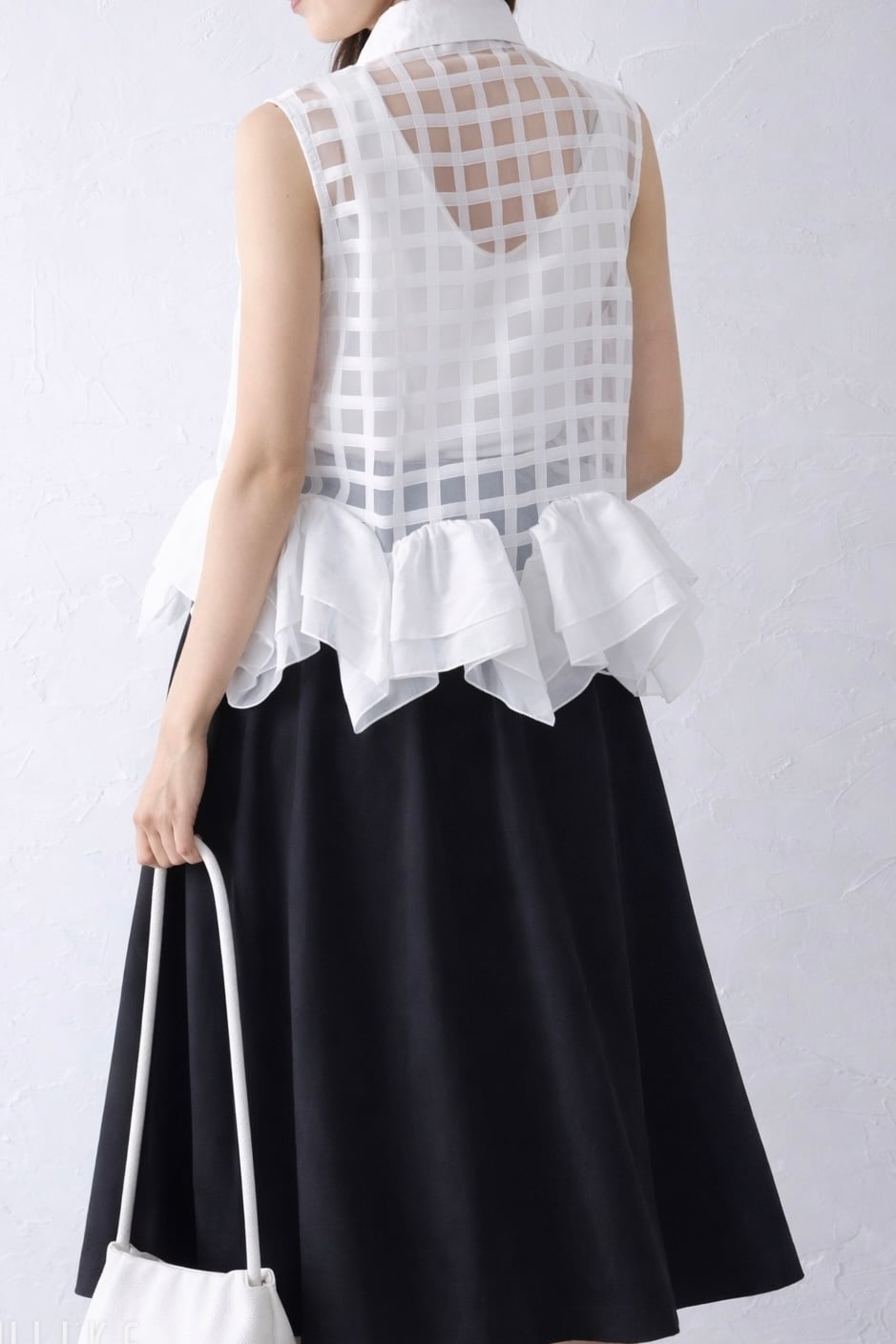 裾のフリルが特徴のシアーベストトップス