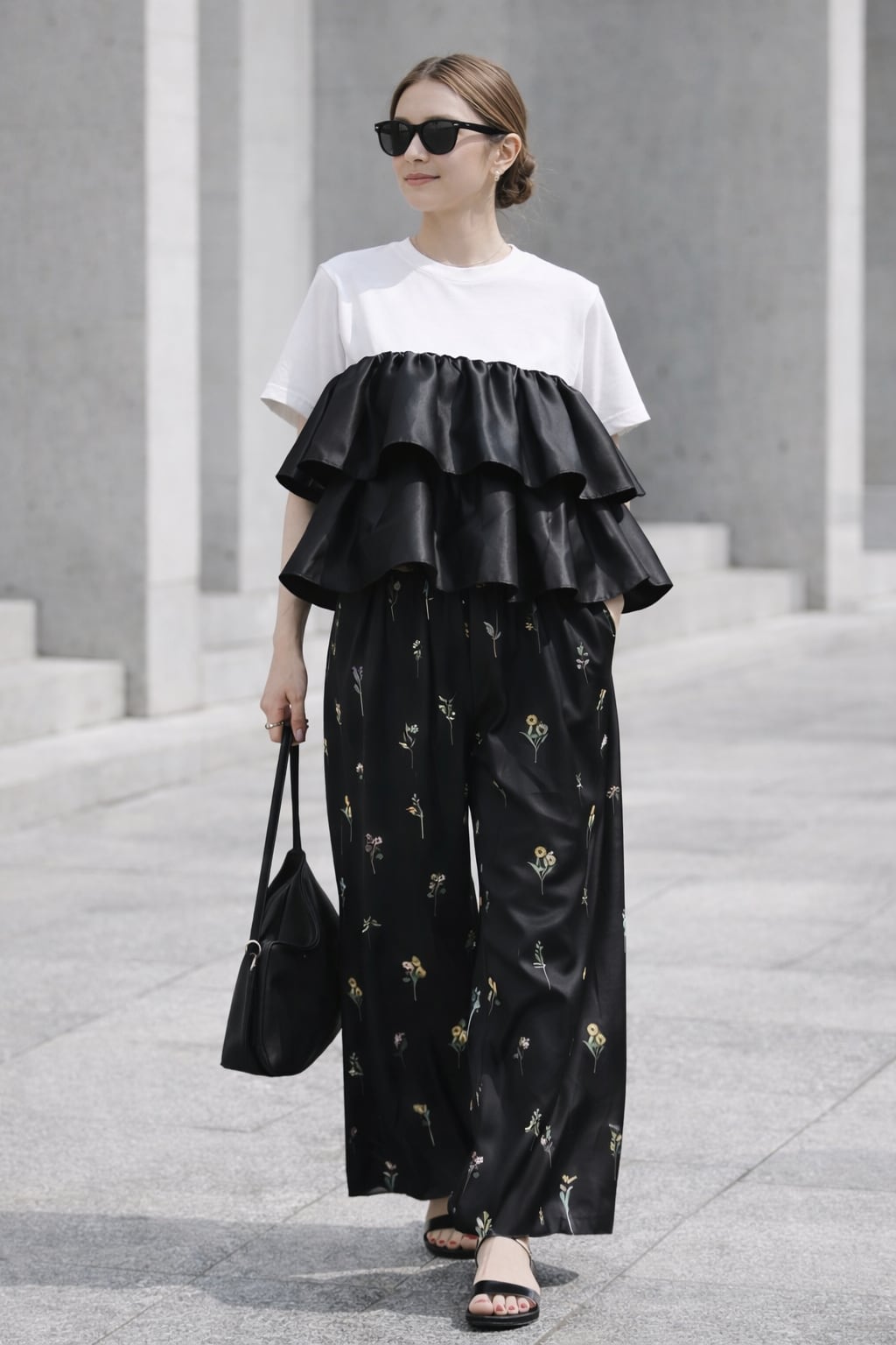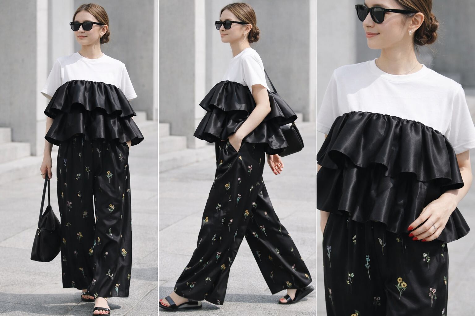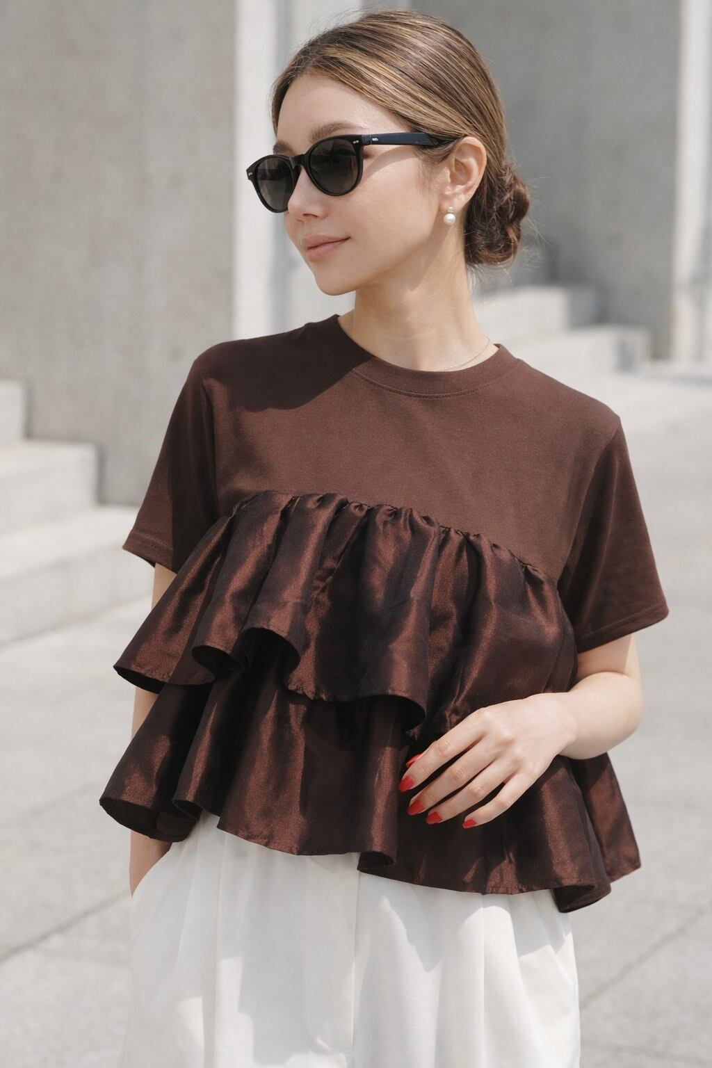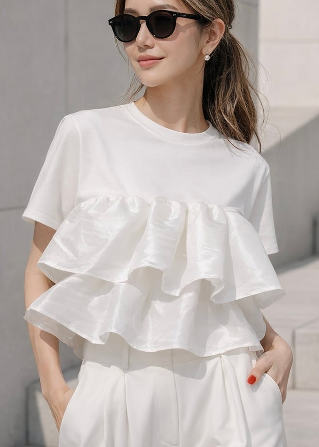 立体感のあるフリルが目を惹く異素材ドッキングTシャツ