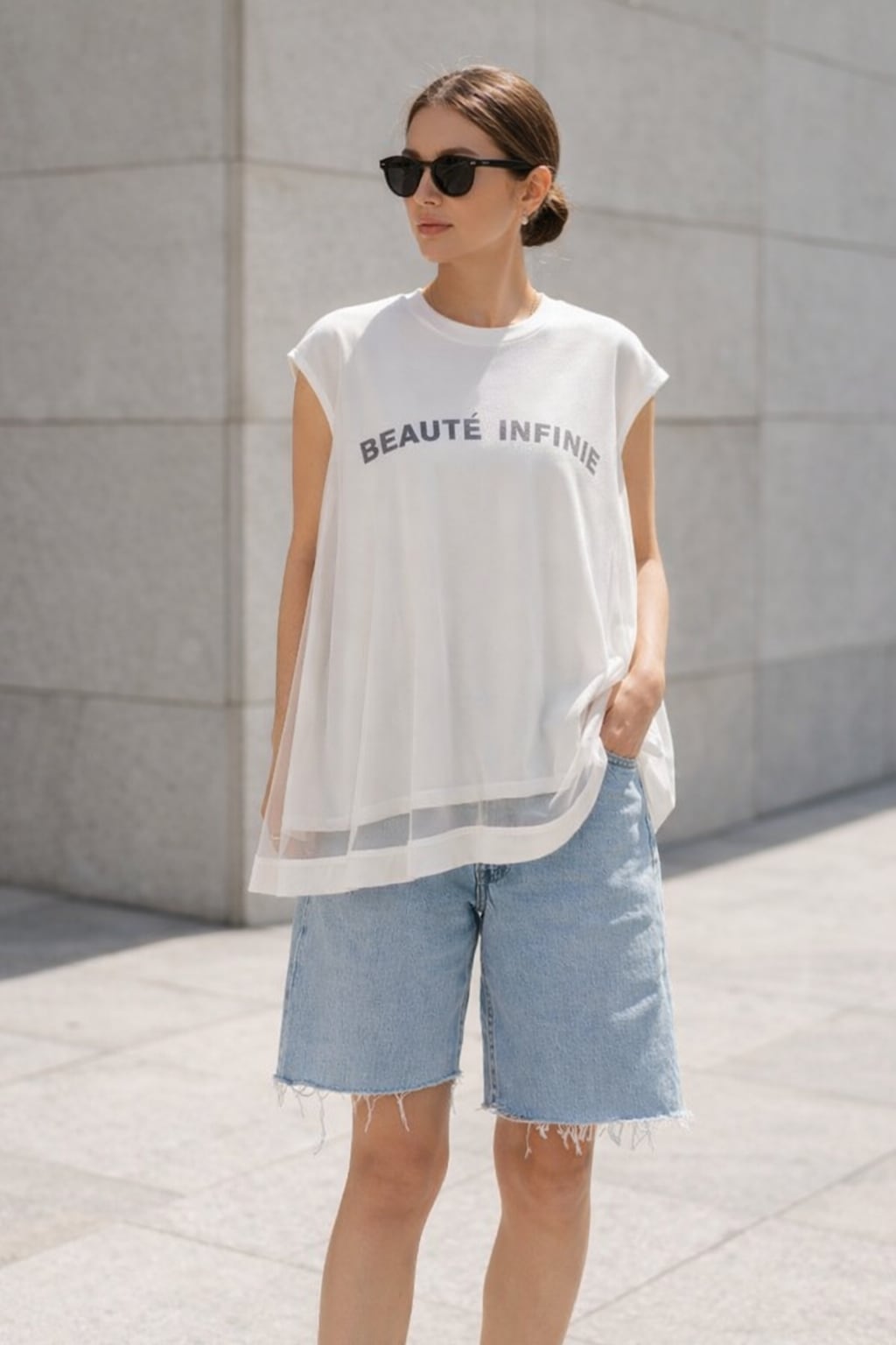 裾まわりに軽やかなシアー感をプラスすることでシンプルすぎず、さりげないデザイン性を楽しめる1枚に仕上がっています。