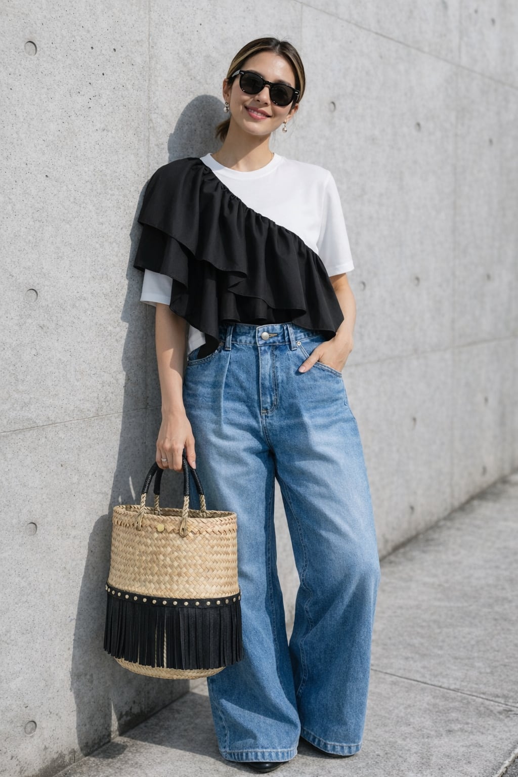 大胆なフリル使いで視線を惹きつける、フロントデザインが主役の半袖Tシャツ