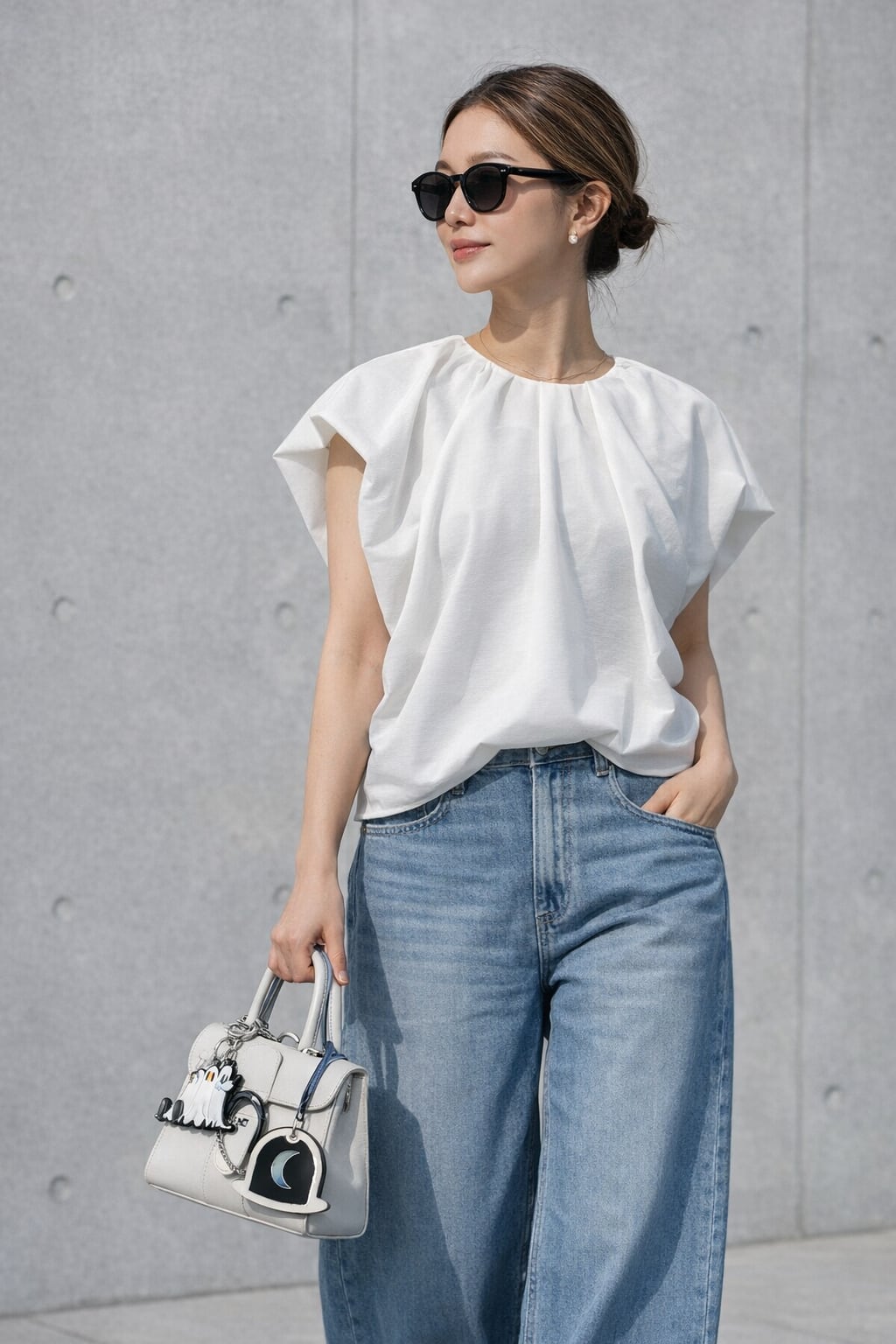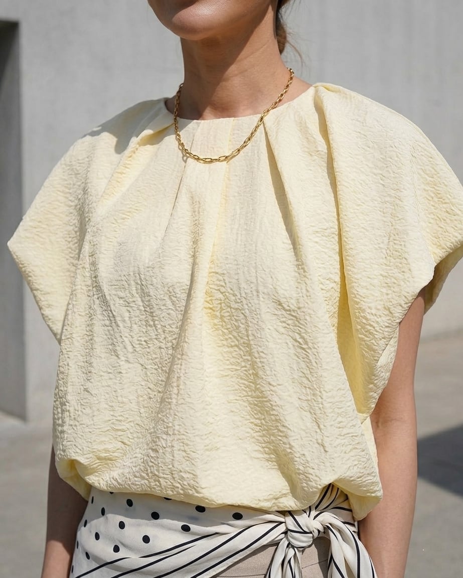 胸元のタックと、二の腕がしっかり隠れるバルーンスリーブが女性らしさと華奢見え効果抜群◎