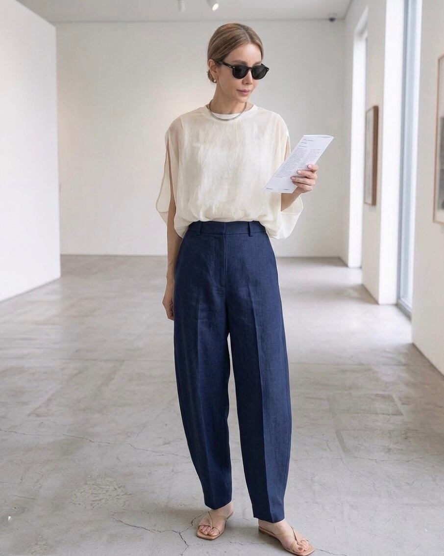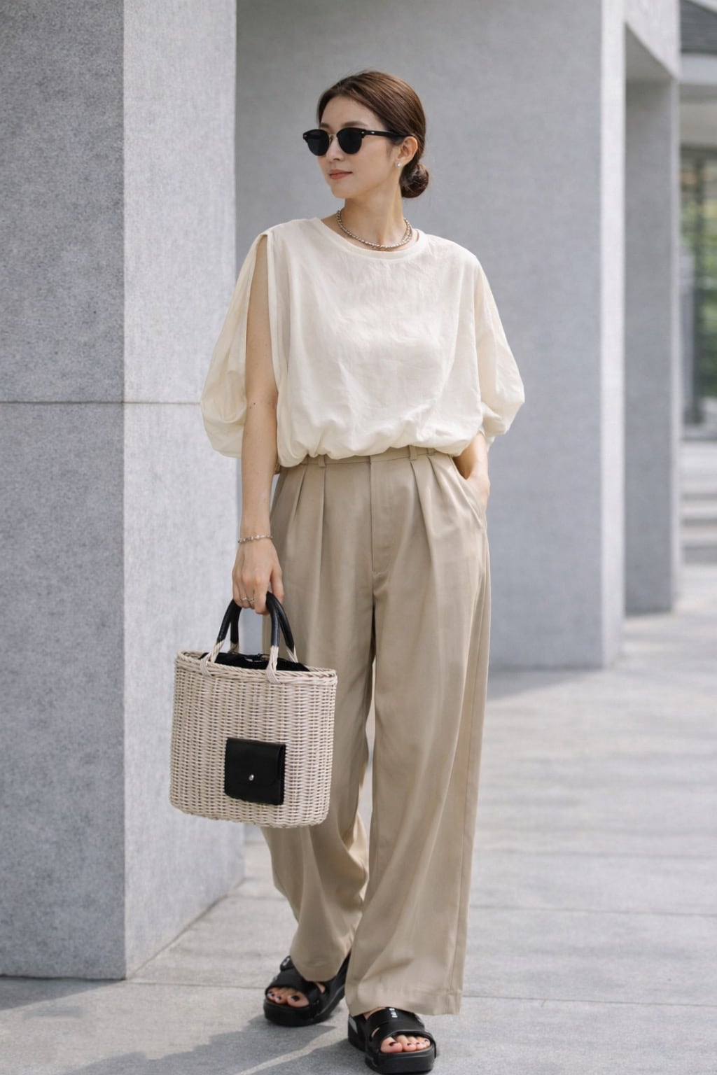 裾のバルーンシルエットはタックイン風に見えることで、脚長効果とレイヤードトップスでトレンド感抜群の一着です。