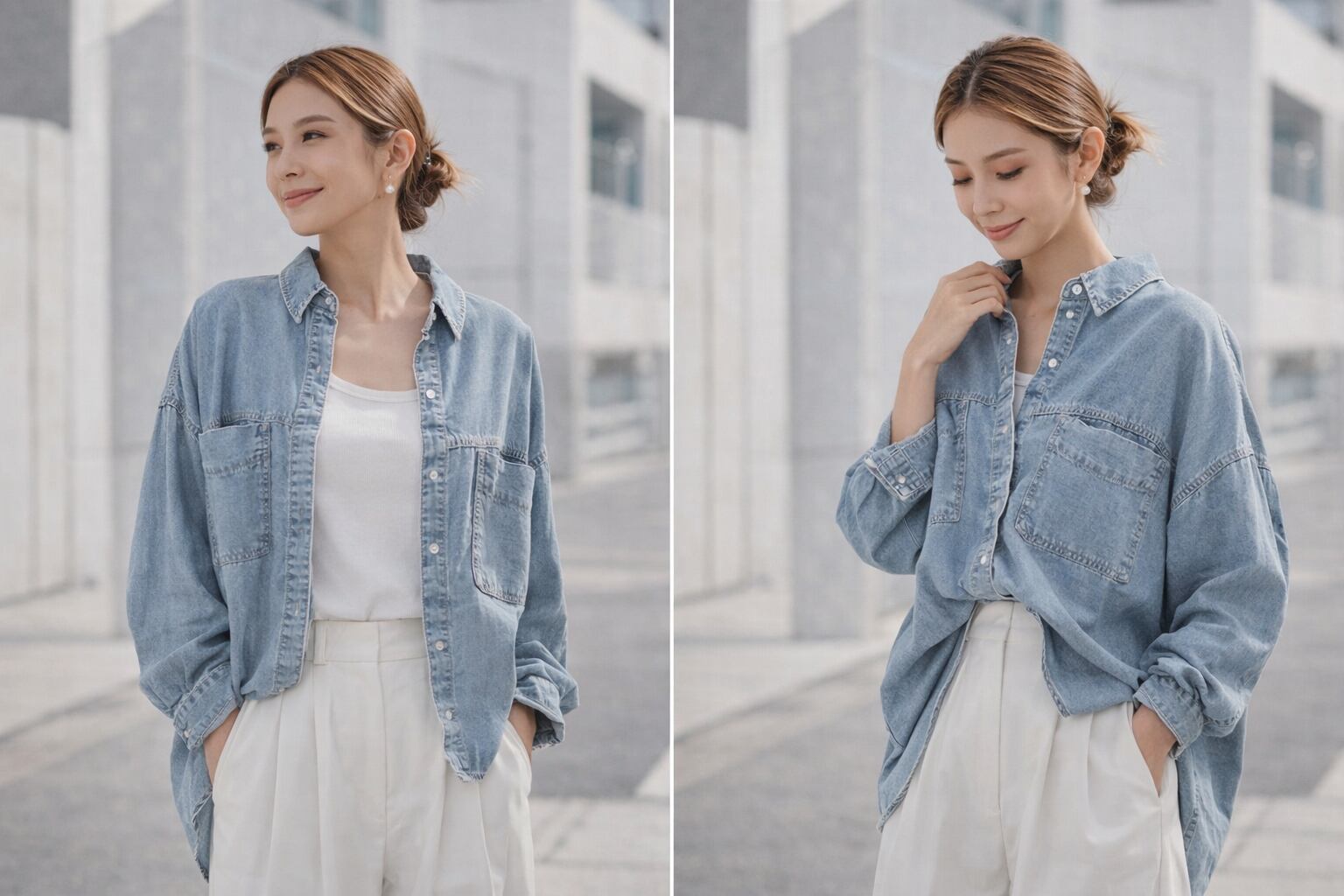 前裾にスナップ釦が付いた2way仕様で、通常のシャツとしてはもちろん、裾を留めて丸みのあるシルエットでも着用可能です