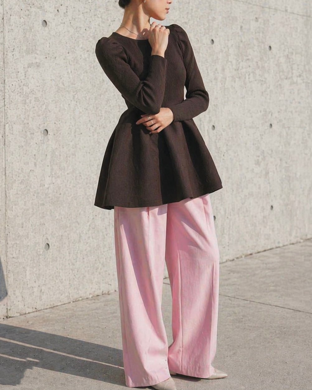 程よくフィットするリブ編みの上身頃と、裾に向かって広がるフレアシルエットが、女性らしい立体感を演出します。