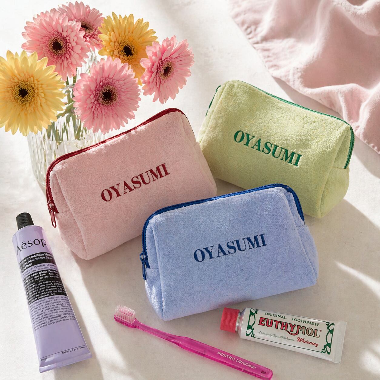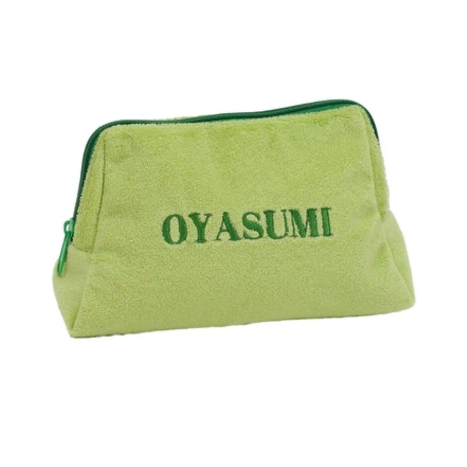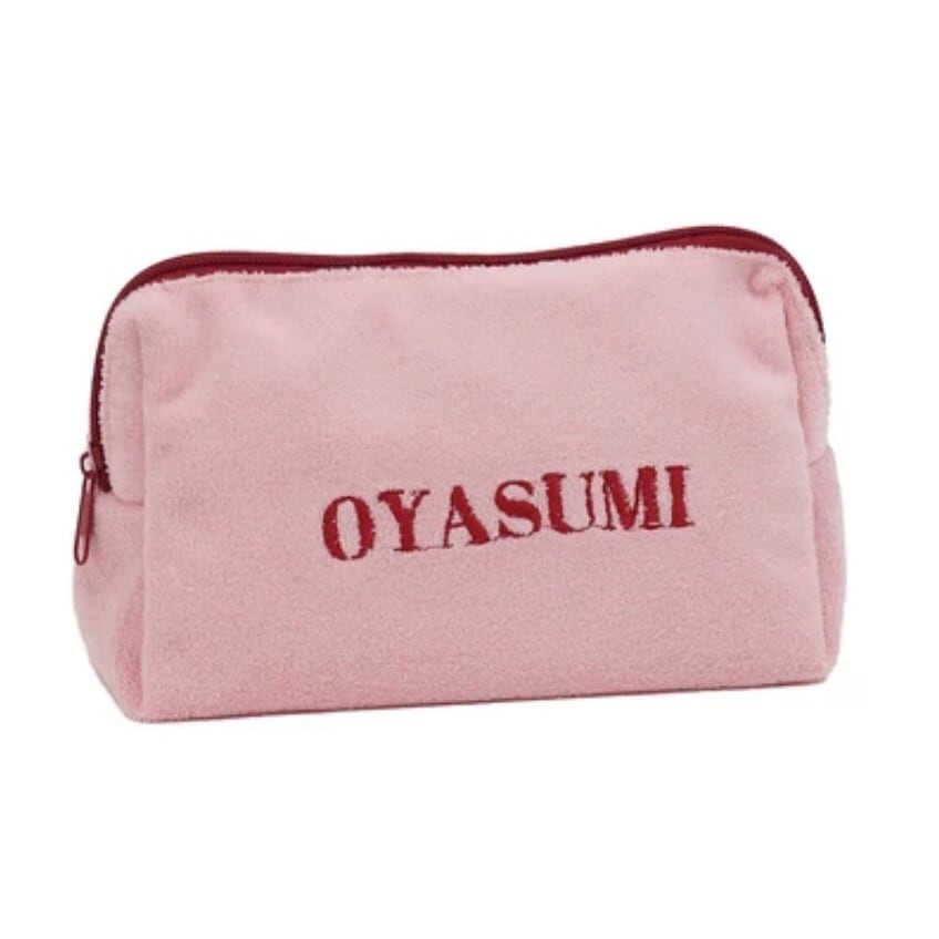 ポーチの表面に刺繍された"OYASUMI"の文字が目を引く、シンプルながらも遊び心を感じるデザイン。