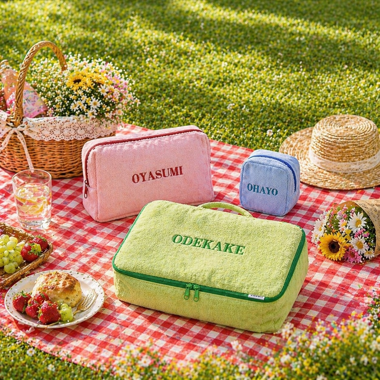 ポーチの表面に刺繍された"ODEKAKE"の文字が目を引く、シンプルながらも遊び心を感じるデザイン。