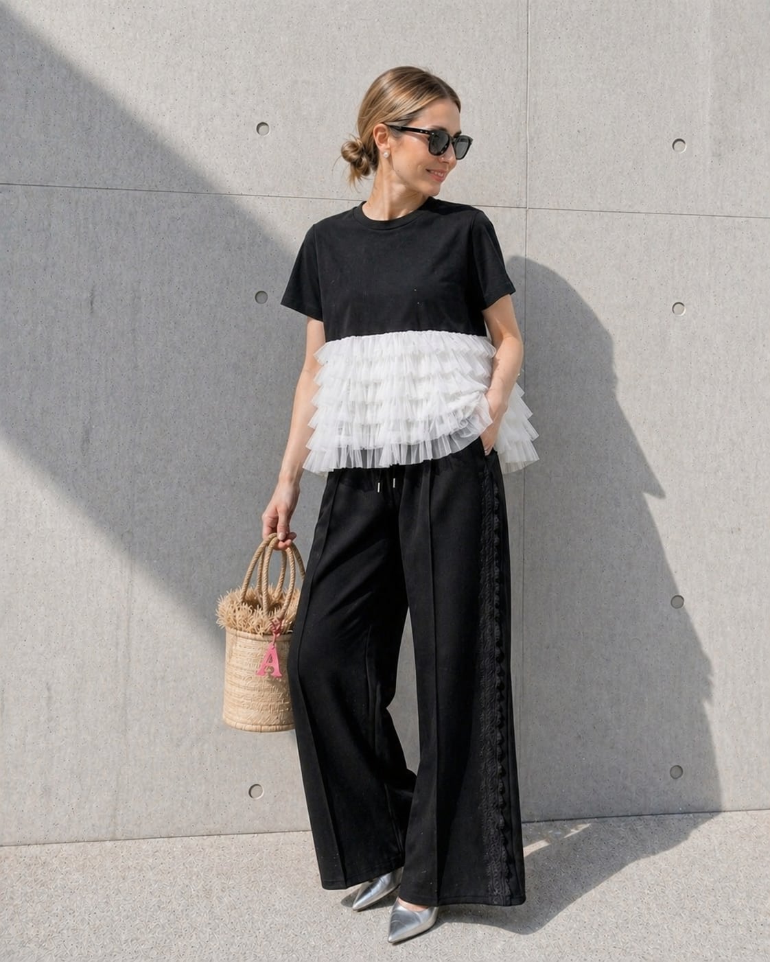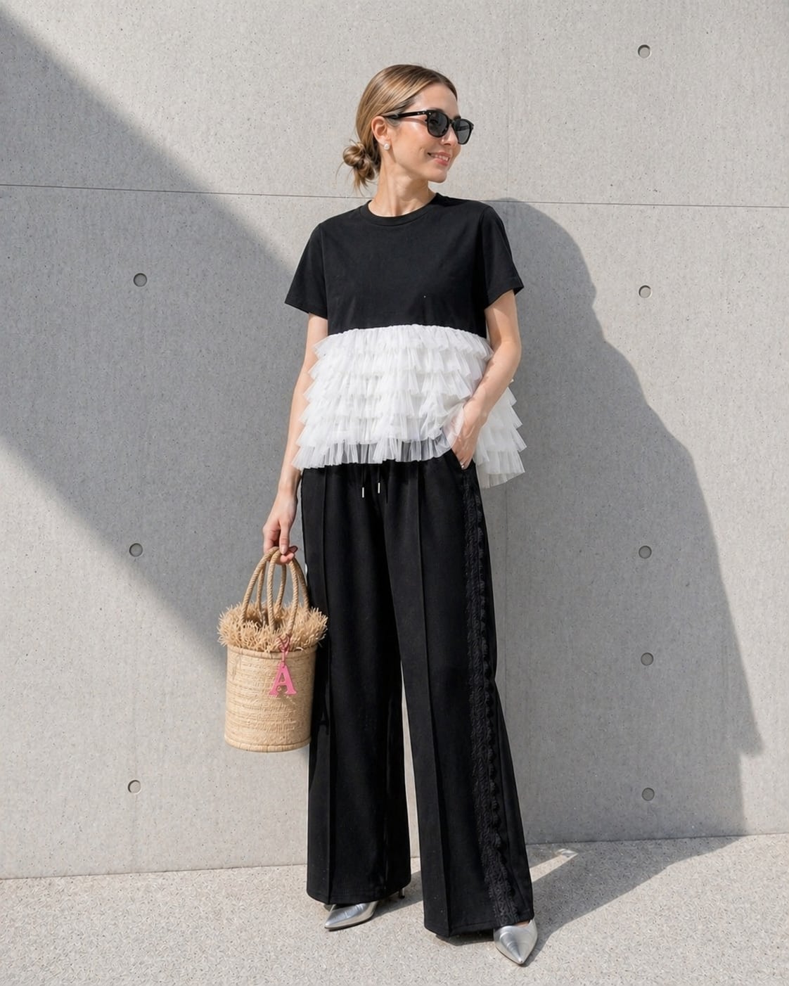 シンプルな黒Tに、ふんわり重なるチュールがポイント。