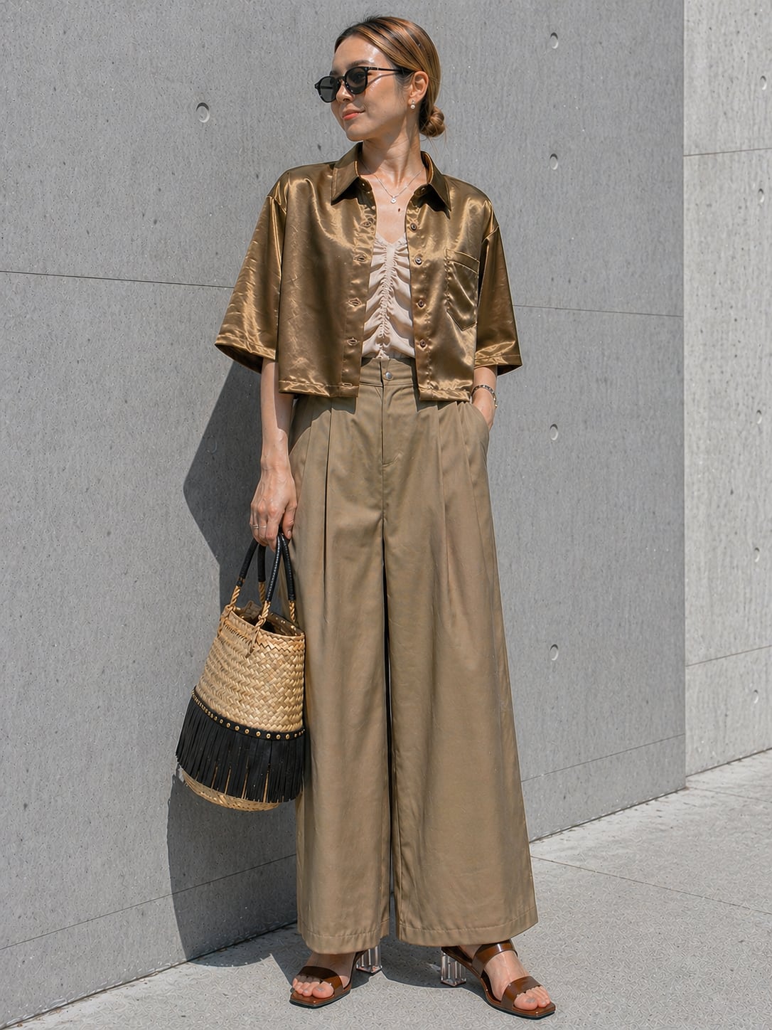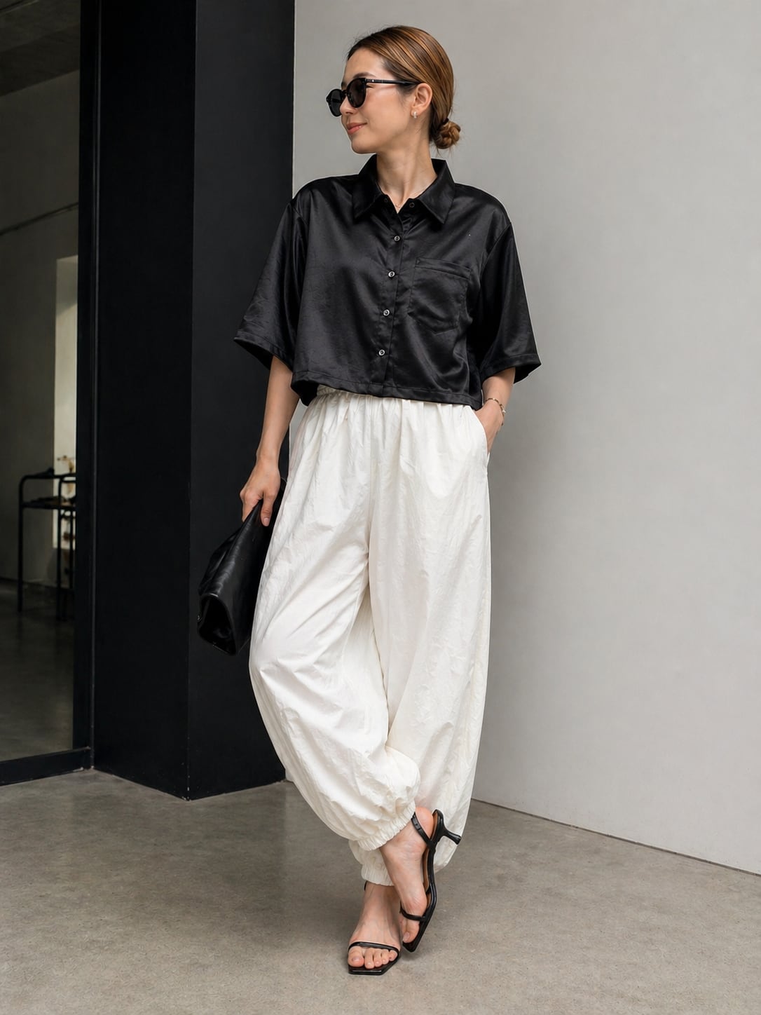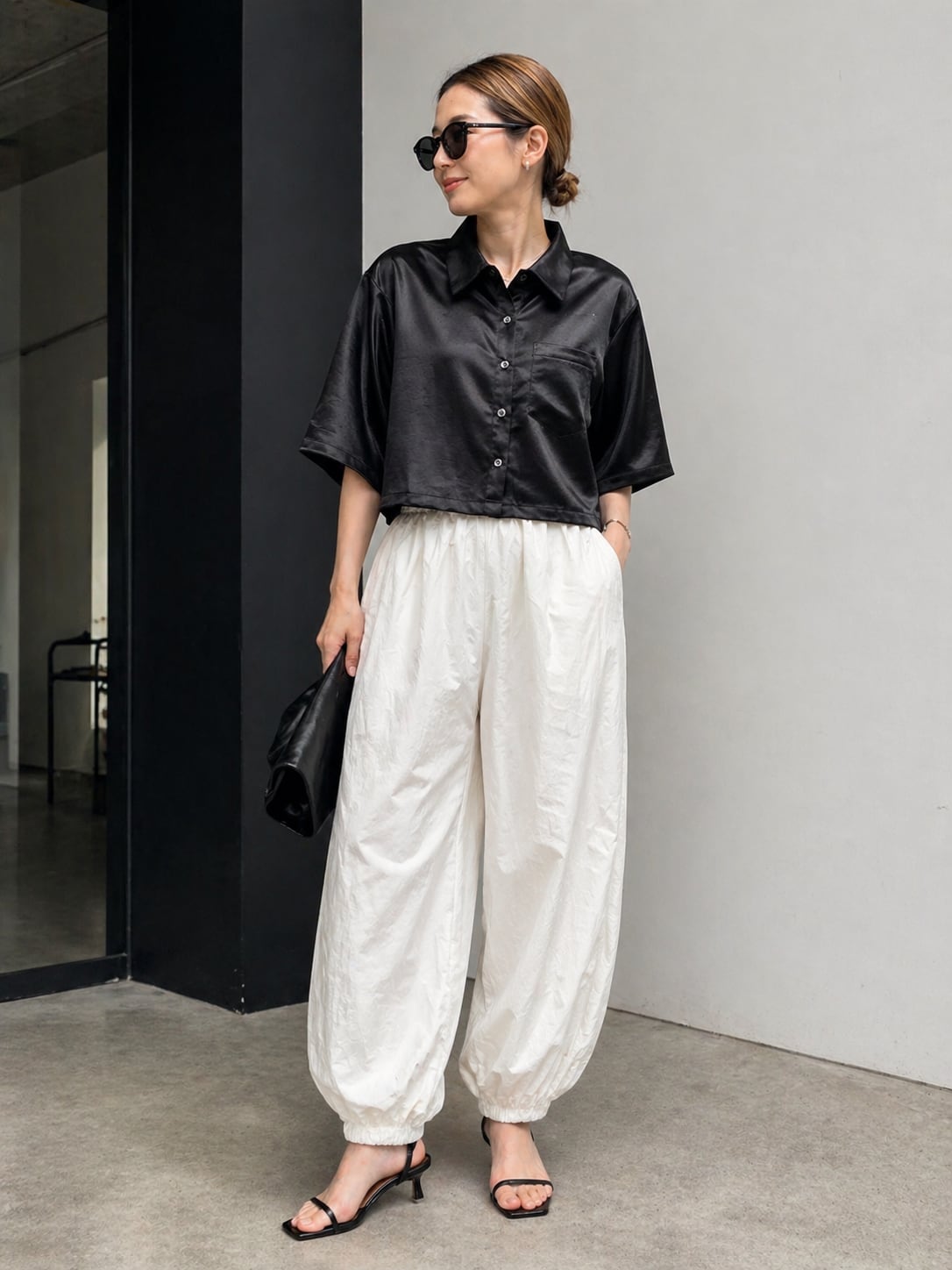 クロップド丈でサテンの風合いもあって女性らしい雰囲気を醸し出し、1枚持っていれば重宝するおススメアイテムです!!