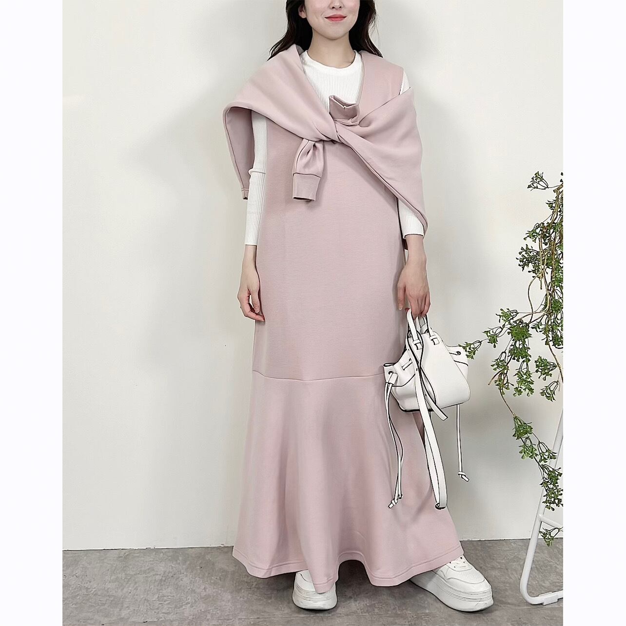 そんな機能性素材を使ったワンピースは、たっぷりとしたロング丈ですらりとした縦ラインを強調しつつ裾の切り替えフレアで足回りをふわりと優しい印象にみせてくれるデザインです。